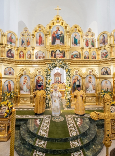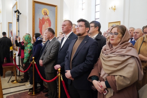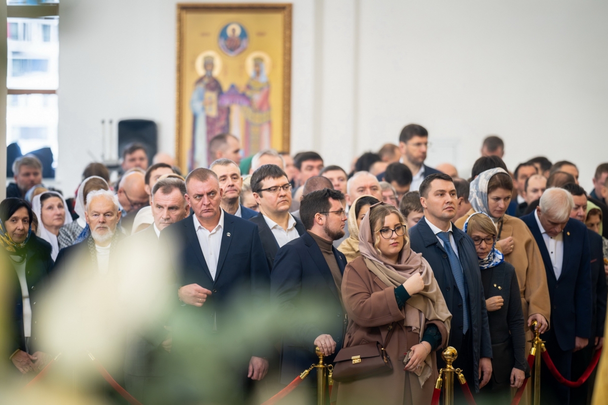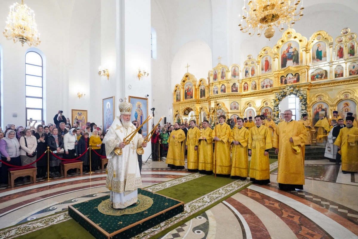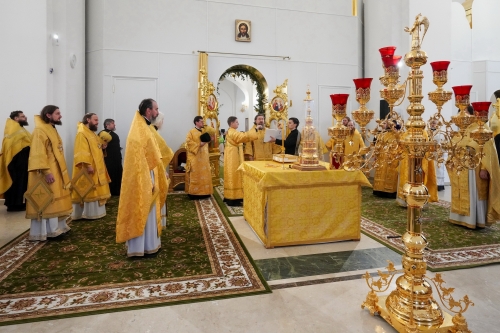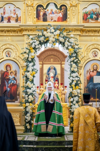 За Литургией Его Святейшеству сослужили: митрополит Воскресенский Григорий, управляющий делами Московской Патриархии, первый викарий Патриарха Московского и всея Руси по г. Москве, наместник Новоспасского ставропигиального монастыря; митрополит Владимирский и Суздальский Никандр, председатель Финансово-хозяйственного управления Московского Патриархата; митрополит Псковский и Порховский Матфей, бывший управляющий Северо-Восточным викариатством, распоряжением Святейшего Патриарха Кирилла от 2 августа 2024 года назначенный, в дополнение к несомым послушаниям, ответственным за строительство Успенского храма в Останкине; митрополит Звенигородский Арсений; епископ Раменский Алексий, личный секретарь Его Святейшества; епископ Бронницкий Иоанн, наместник Высоко-Петровского ставропигиального монастыря; протопресвитер Владимир Диваков, секретарь Патриарха Московского и всея Руси по г. Москве; протоиерей Анатолий Алефиров; протоиерей Георгий Климов; столичное духовенство.