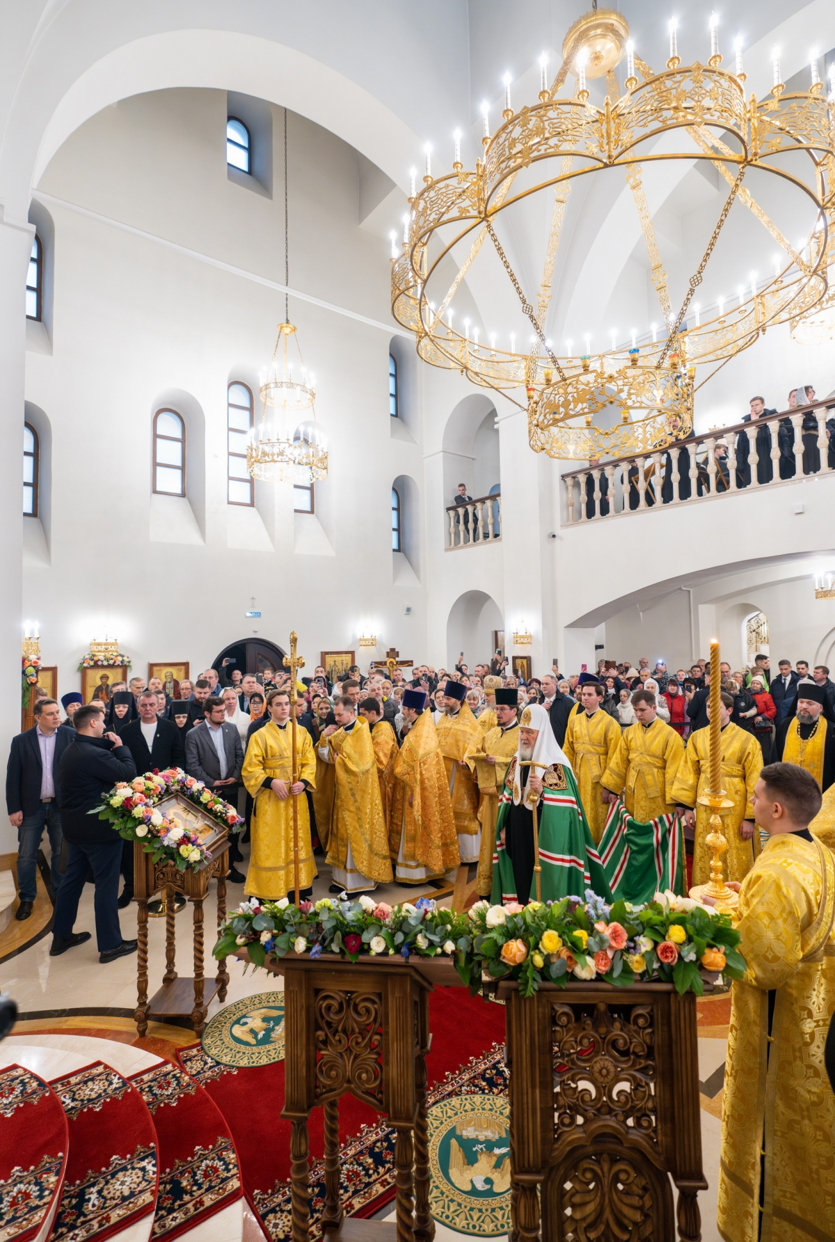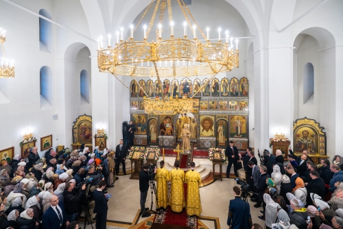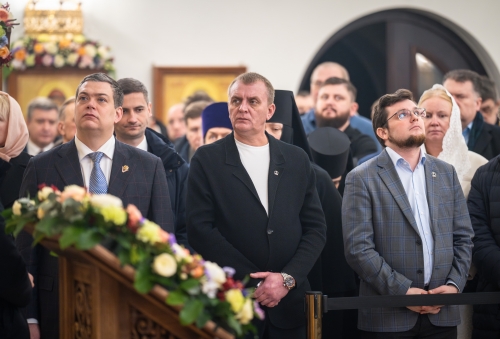 За богослужением Предстоятель Русской Православной Церкви освятил два престола: в честь святителя Николая Мирликийского и в честь Всех святых земли Русской. Также Святейший Владыка освятил 20 антиминсов.
