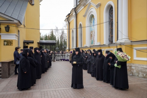 У ворот монастыря Предстоятеля Русской Православной Церкви встречали настоятельница игумения Феофания (Мискина) с сестрами обители, воспитанницы монастырского приюта. В числе встречавших был также председатель Либерально-демократической партии России, руководитель фракции ЛДПР в Государственной Думе Федерального Собрания Российской Федерации, председатель Комитета Государственной Думы по международным делам Л.Э. Слуцкий.