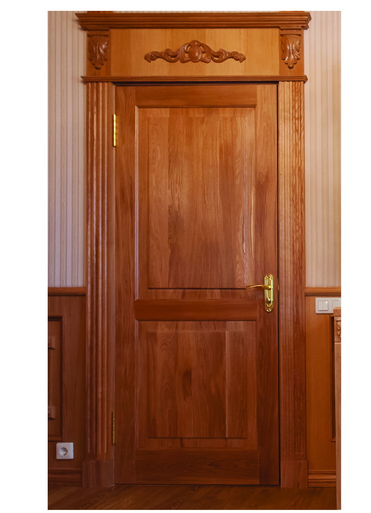 Дверь одностворчатая. Размеры: 800 х 2040 мм. Материал: массив дуба, морение, лак. Портал под заказ. Возможно изготовление по индивидуальным размерам.