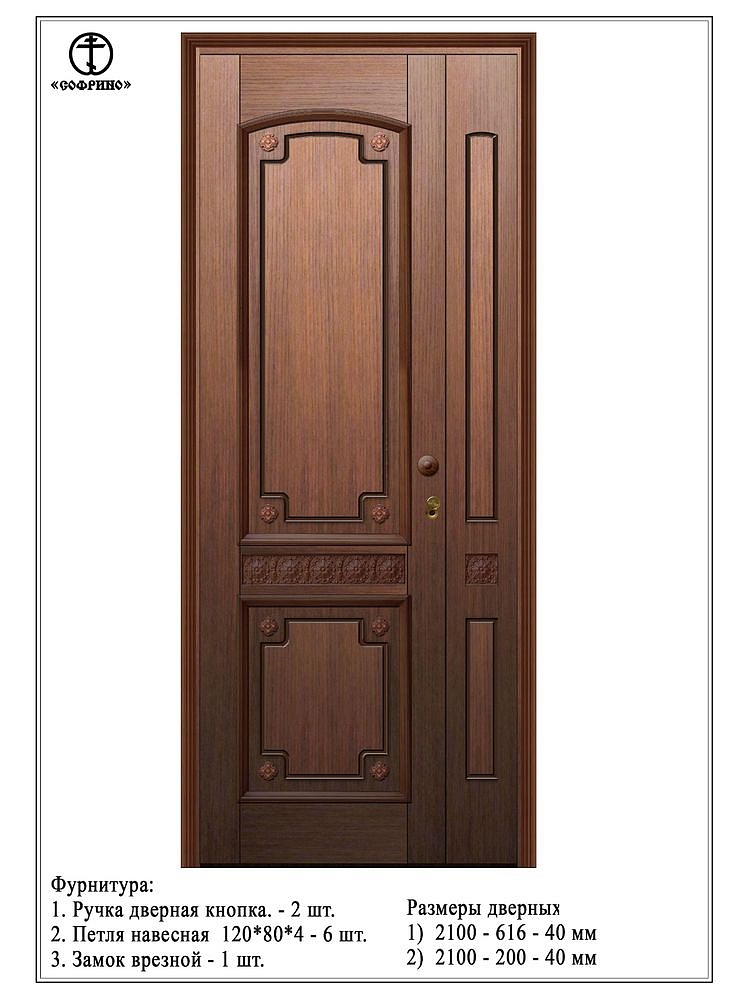 Дверь двухстворчатая, размеры: 1-я створка 620 х 2010 мм, 2-я створка 200 х 2010 мм, общий 820 х 2010 мм. Материал: массив дуба, морение, лак. Возможно изготовление по индивидуальным размерам.