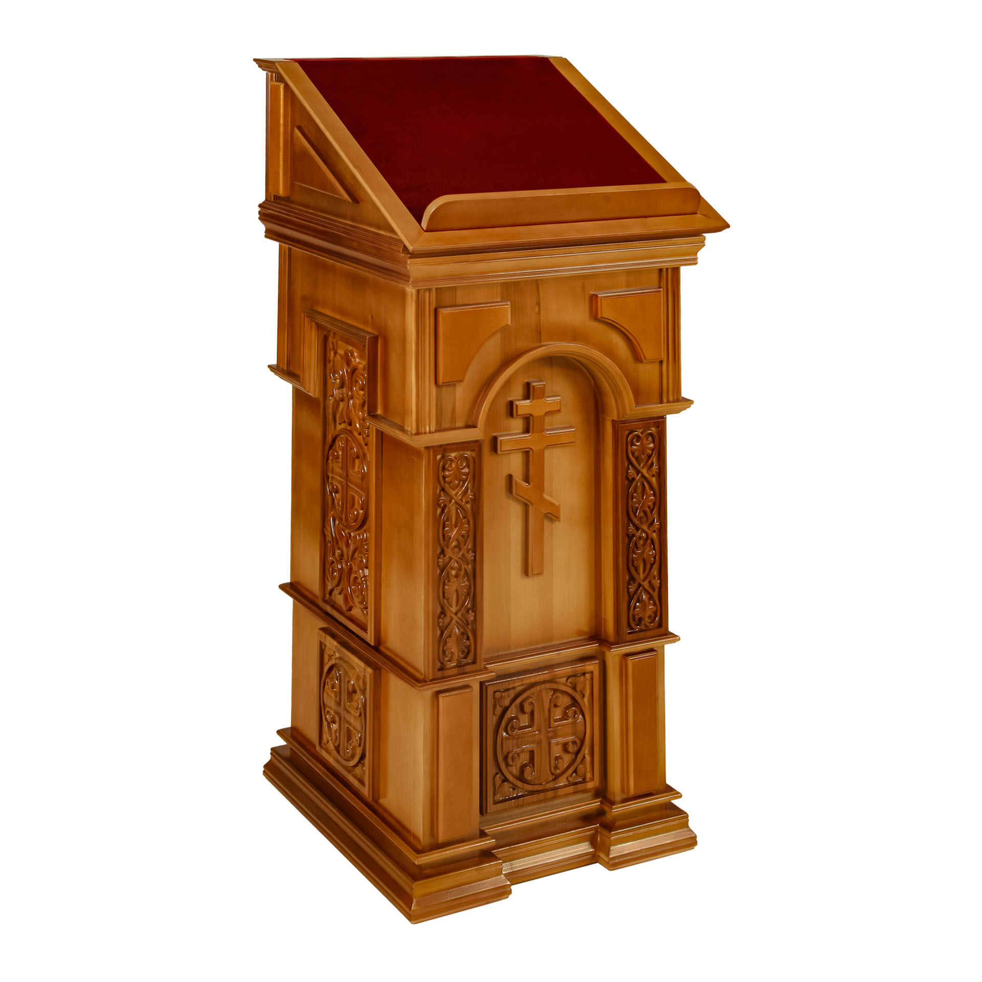 Устойчивый тумбовый аналой, украшенный объемными крестами и изящными геометрическими узорами, подойдет на роль центрального или бокового аналоя. Высокий деревянный бортик и шершавое тканевое покрытие верха уберегут икону от скольжения и падения. Благодаря приятному цвету светлого дерева, данный аналой впишется в интерьер любого деревянного храма.