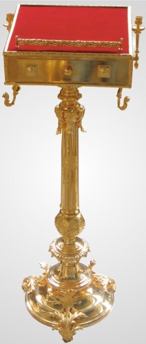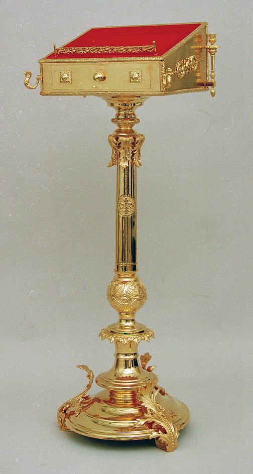 Позолоченный аналой-пюпитр на устойчивой ножке будет удобен для размещения в алтаре. Компактная конструкция позволит сэкономить место, а высокий бортик и тканевая поверхность уберегут служебник от падения. У данной модели аналоя есть подсвечник, крючки для кадила, а также выдвижной ящик с внутренними размерами 280х230х40 мм, удобный для хранения мелких предметов. Нижнее основание - 430 мм.