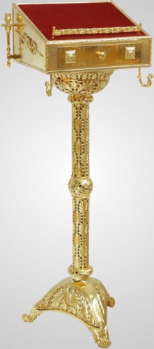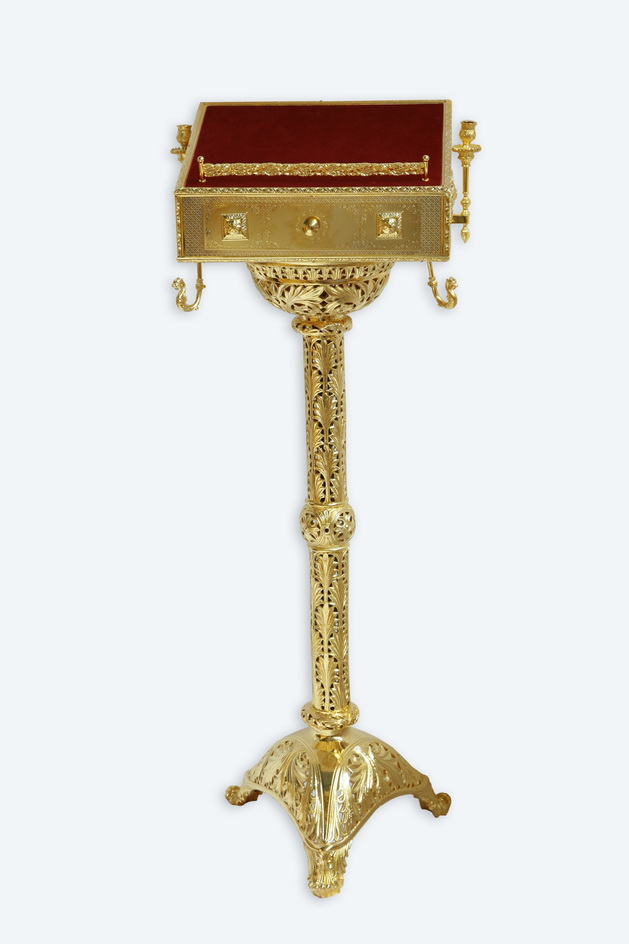 Аналой-пюпитр на устойчивой ножке, украшенной геометрическим узором, будет удобен для размещения в алтаре. Компактная конструкция позволит сэкономить место, а высокий деревянный бортик убережет служебник от падения. У данной модели аналоя есть два подсвечника и два крючка для кадила, а также выдвижной ящик с внутренними размерами 280х230х40 мм, удобный для хранения мелких предметов. Нижнее основание - 410 мм.