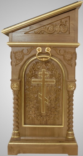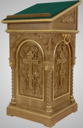 Устойчивый тумбовый аналой из массива дуба, украшенный тонкой резьбой и золочением, идеально подойдет на роль центрального аналоя. Высокий деревянный бортик и шершавое тканевое покрытие верха уберегут икону от скольжения и падения. Благодаря прочному материалу и лаковому покрытию, этот аналой отличается особой прочностью.