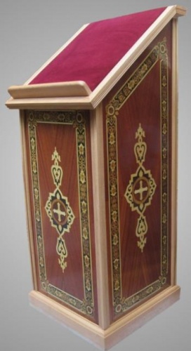 Устойчивый тумбовый аналой, украшенный геометрическими узорами, идеально подойдет для размещения в храме с лежащей сверху иконой. Высокий деревянный бортик и шершавое тканевое покрытие верха уберегут икону от скольжения и падения.