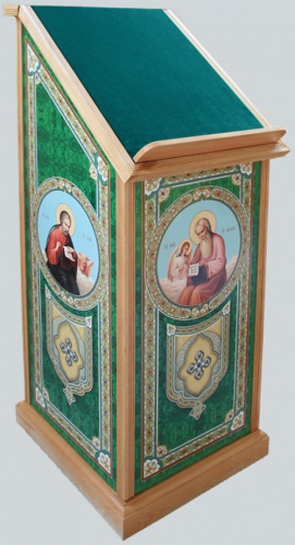 Устойчивый тумбовый аналой идеально подойдет для размещения в храме с лежащей сверху иконой. Высокий деревянный бортик и шершавое тканевое покрытие верха уберегут икону от скольжения и падения. На боковых частях аналоя изображены апостолы-Евангелисты: Матфей, Марк, Лука и Иоанн.