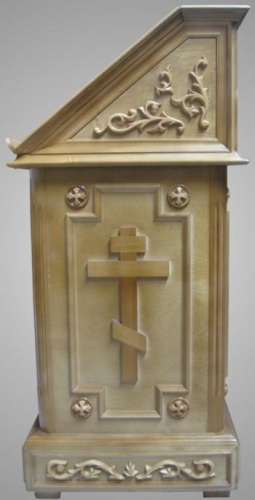 Тумбовый аналой, украшенный объемными крестами и геометрическими узорами, идеально подойдет для размещения в храме в качестве центрального или бокового аналоя. Высокий деревянный бортик и шершавое тканевое покрытие верха уберегут икону от скольжения и падения.