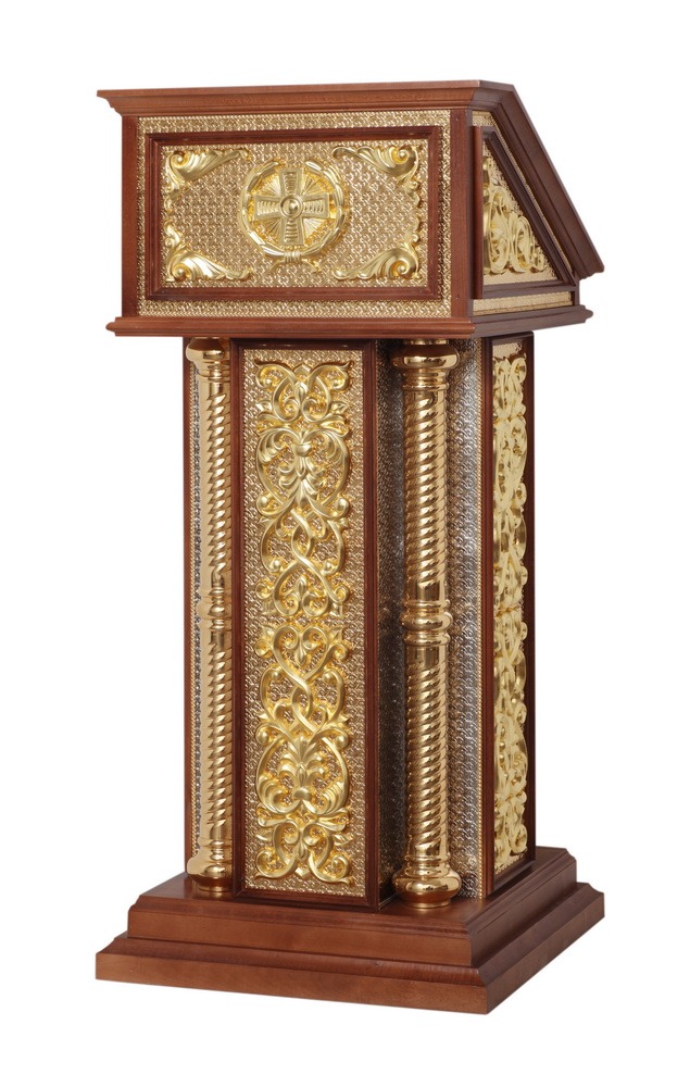 Тумбовый аналой из массива дерева, украшенный позолоченной резьбой, идеально подойдет на роль центрального аналоя. Высокий деревянный бортик и шершавое тканевое покрытие верха уберегут икону от скольжения и падения. Из-за необычной формы, напоминающей кафедру, данный аналой будет гармонично смотреться только храме с современным интерьером.