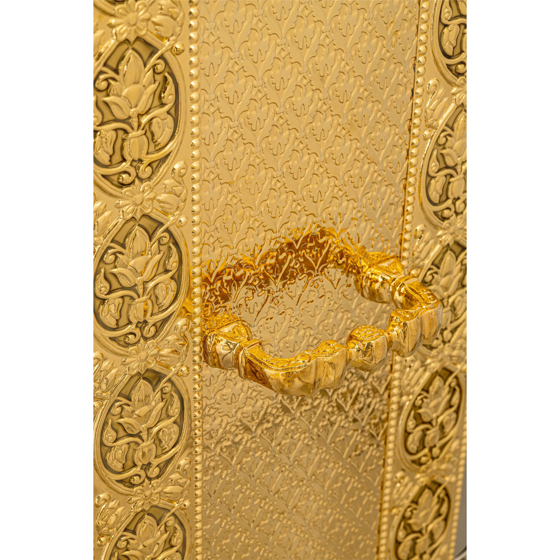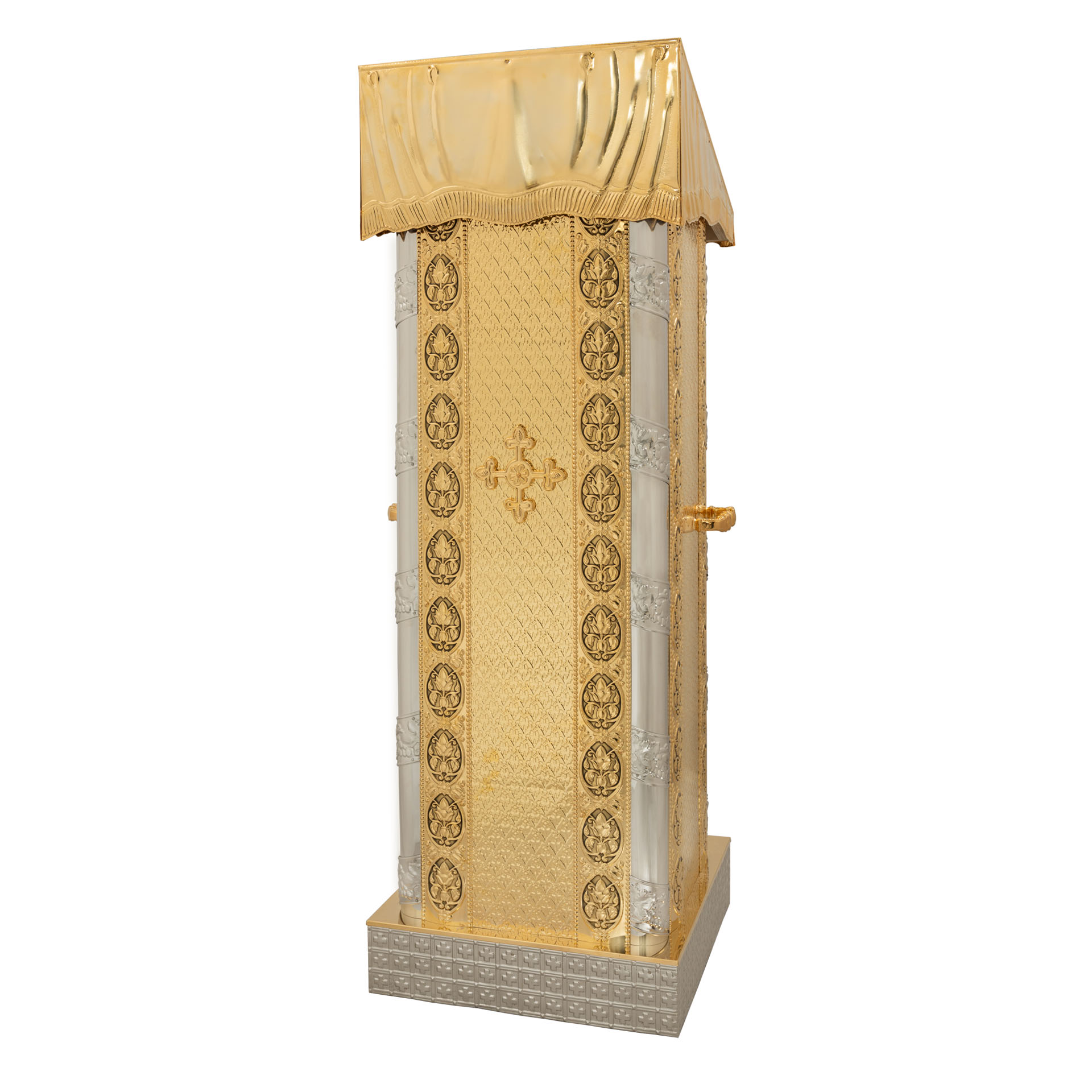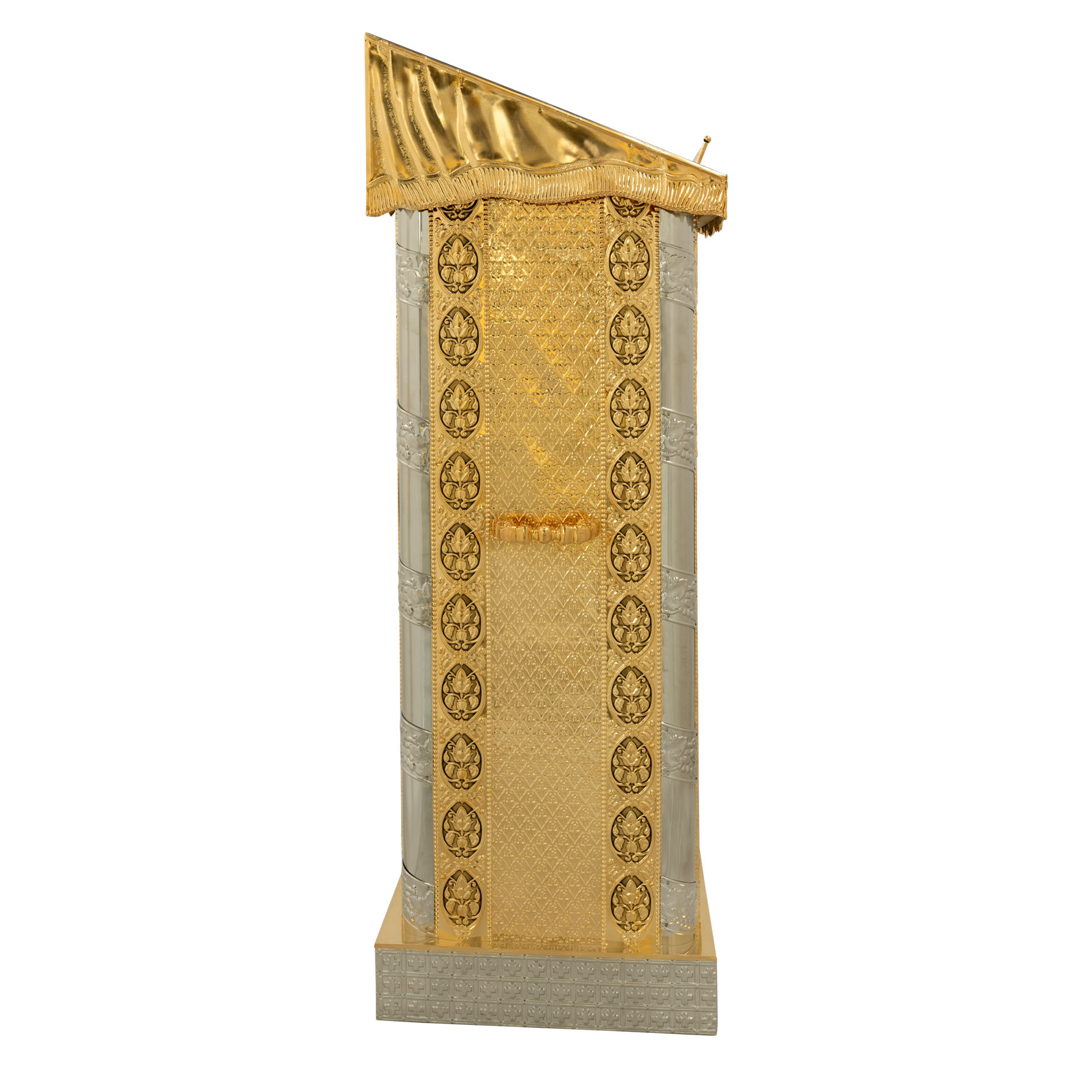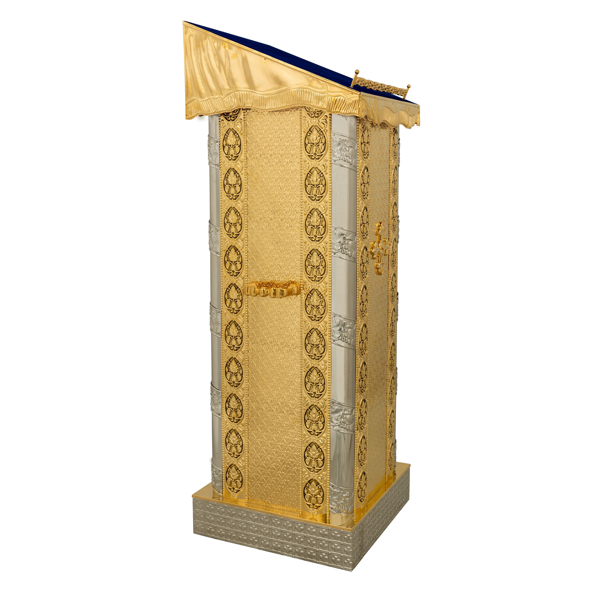 Изящный тумбовый аналой, сочетающий в себе серебрянные и золотые оттенки, идеально подойдет на роль центрального или бокового аналоя. Бортик и шершавое тканевое покрытие верха уберегут икону от скольжения и падения, причем цвет бархата может быть изменен по желанию заказчика. Размер нижнего основания - 43 х 43 см.