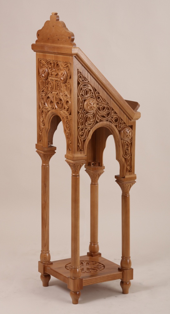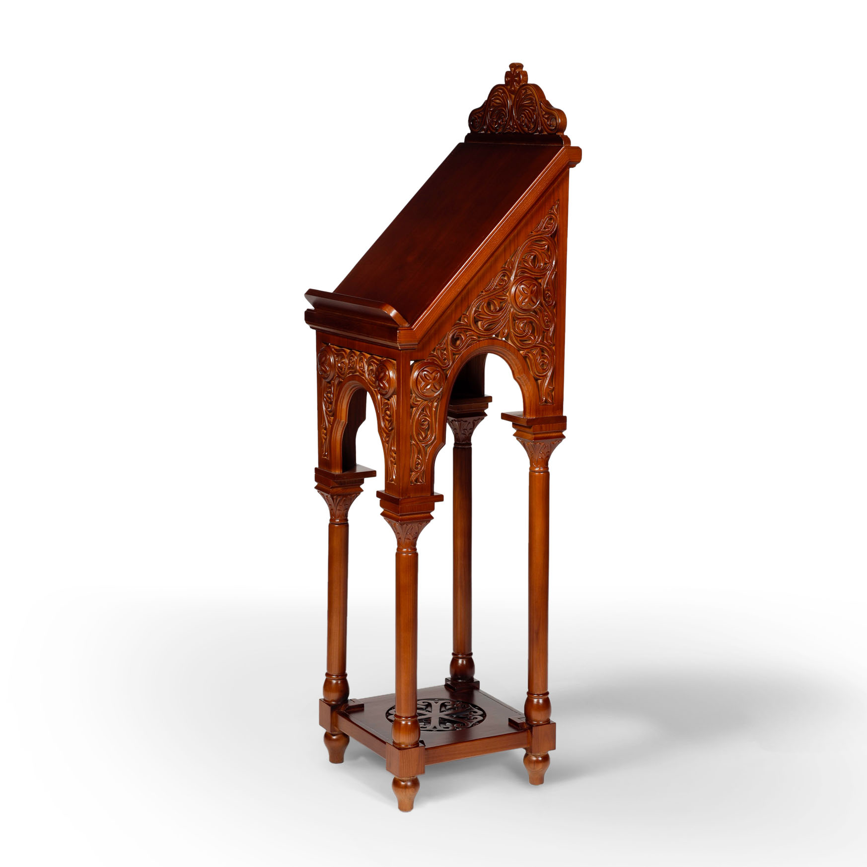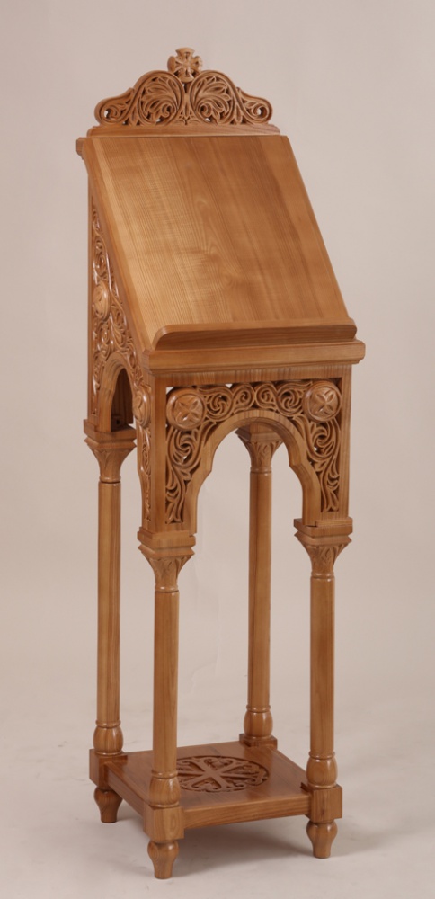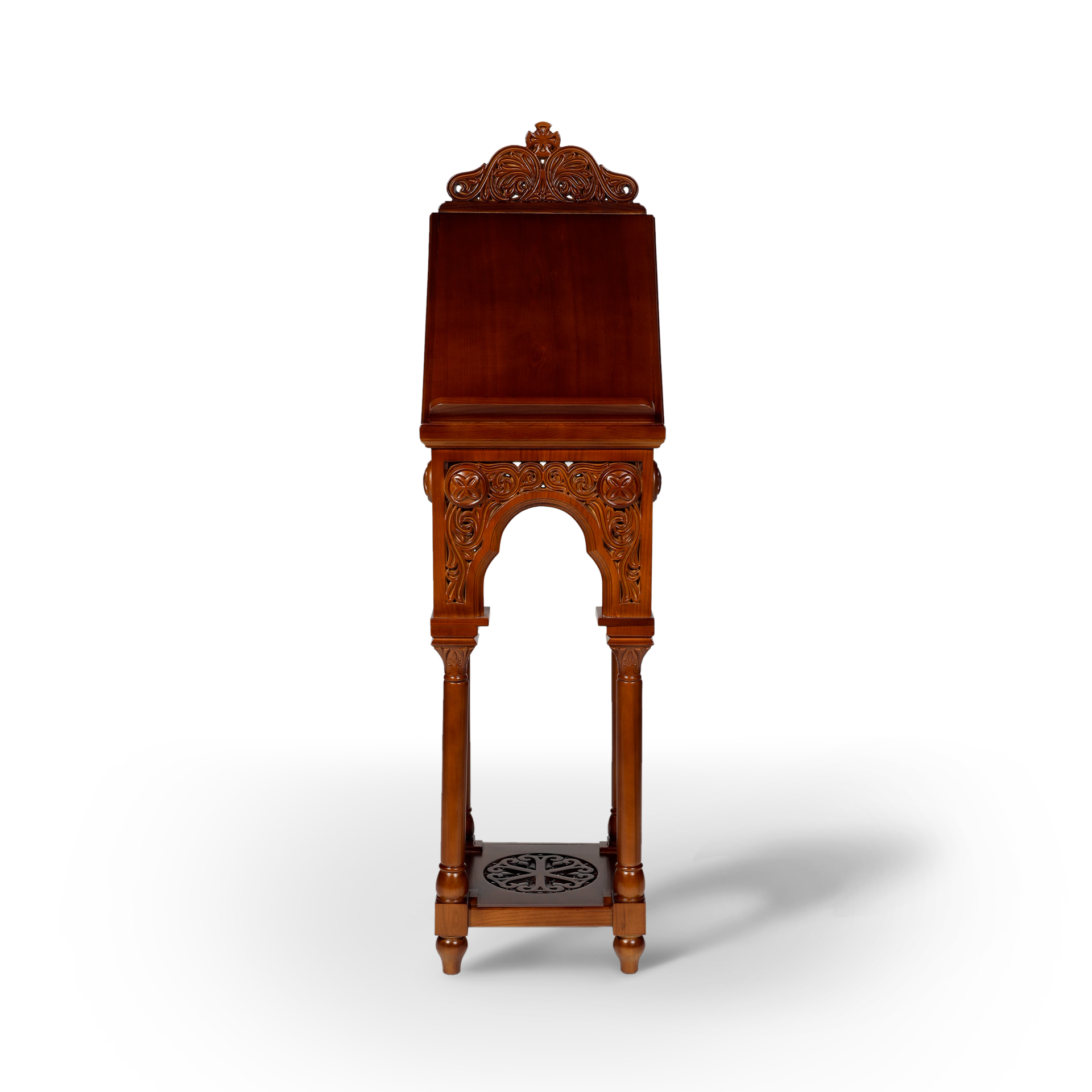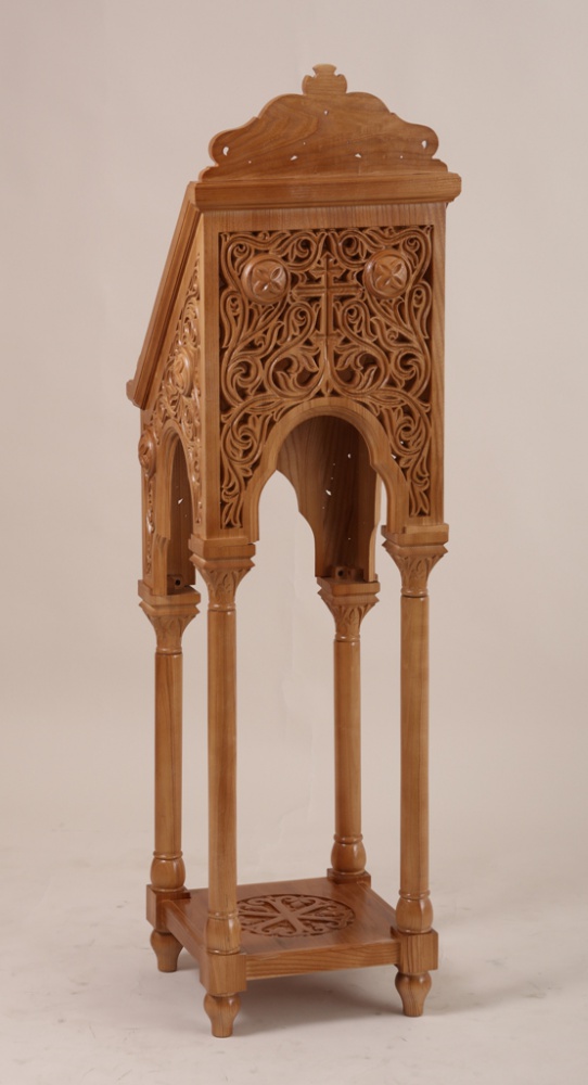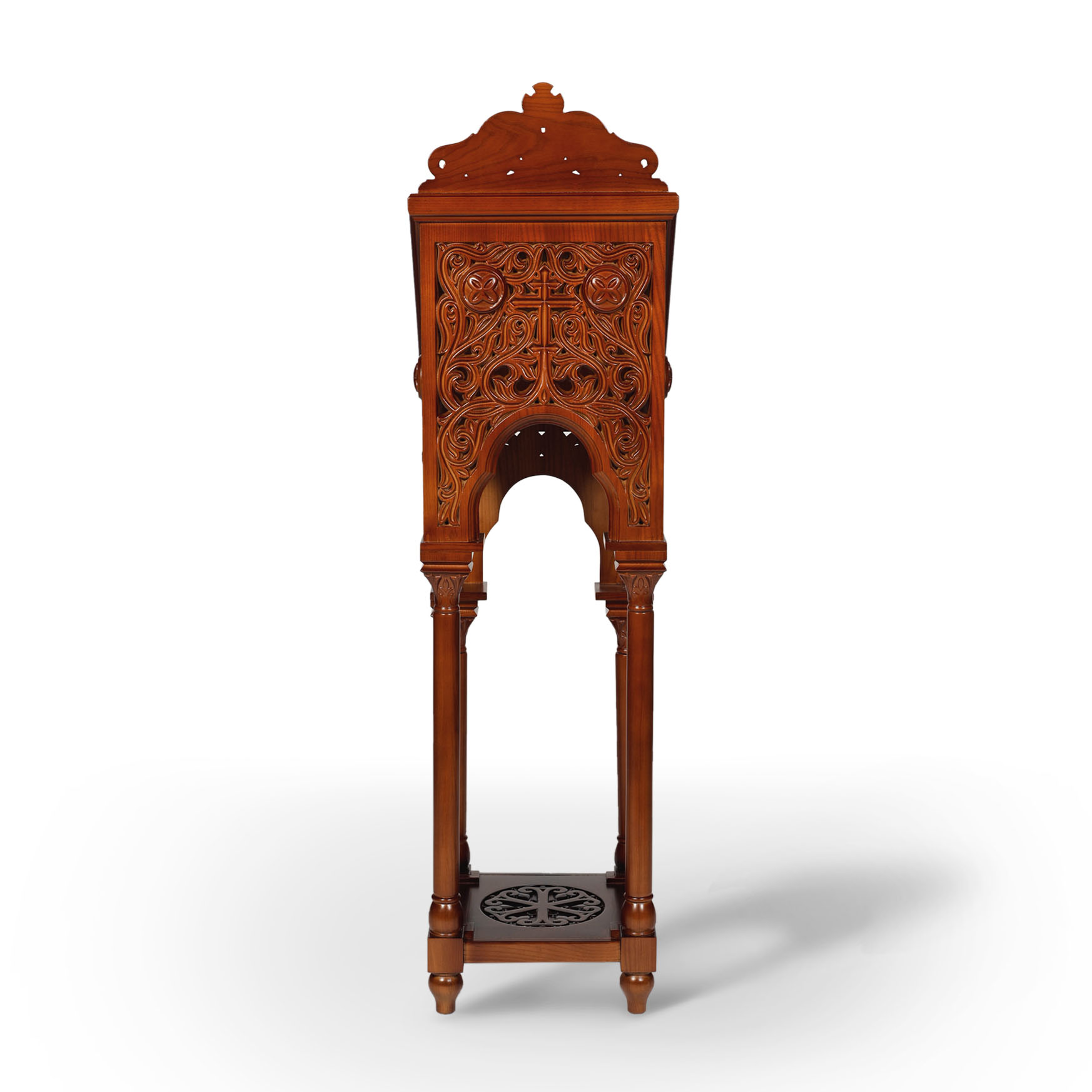 Данная модель аналоя на ножках, украшенная тонкой деревянной резьбой, подойдёт на роль центрального или бокового аналоя. Компактная конструкция позволит сэкономить место, а высокий деревянный бортик убережет икону от падения. На открытой декоративной полке в нижней части аналоя будет красиво смотреться ваза с цветами. Благодаря приятному нейтральному цвету данная модель впишется практически в любой интерьер храма.