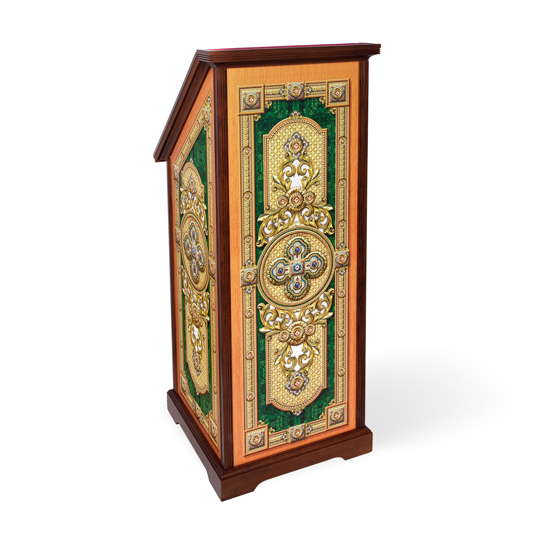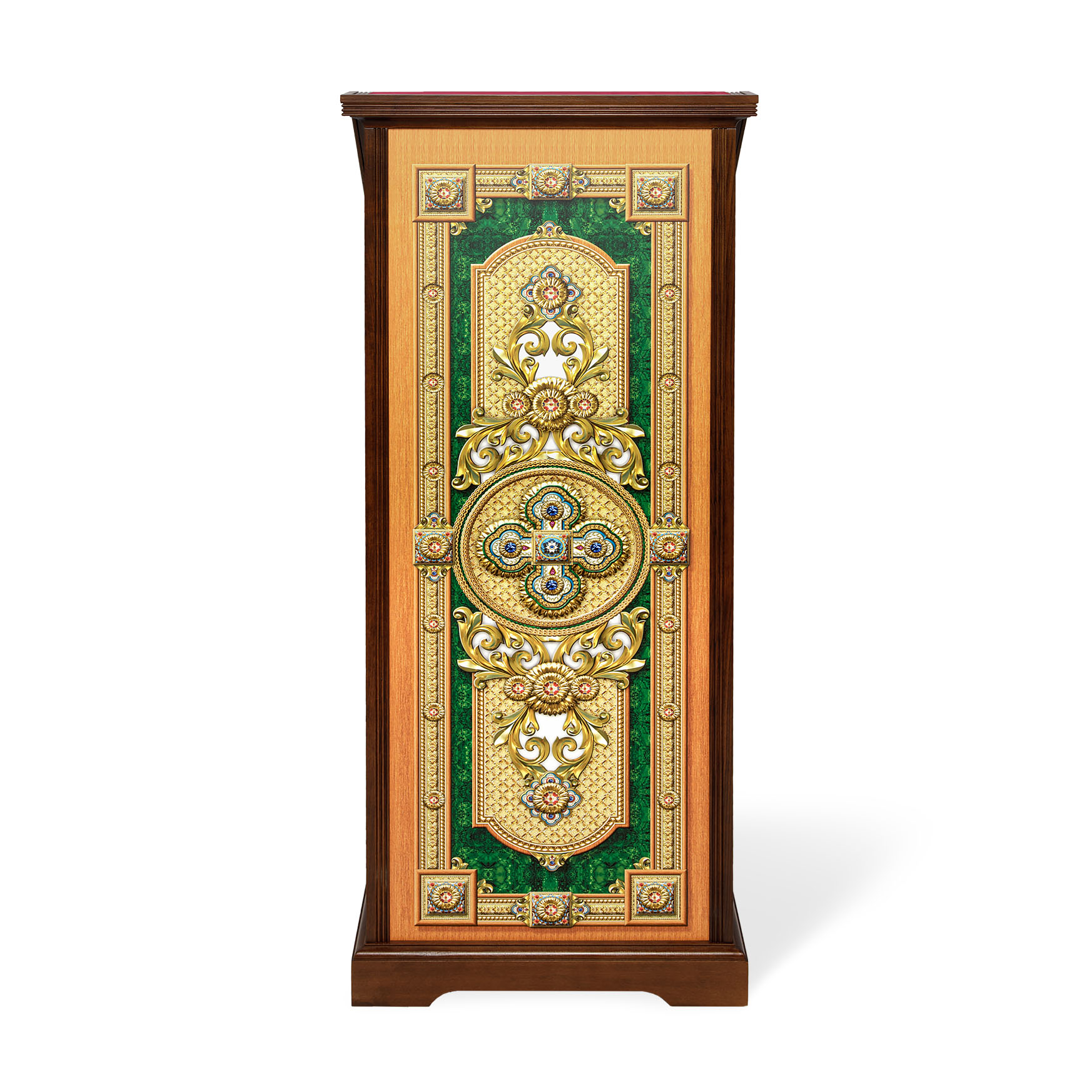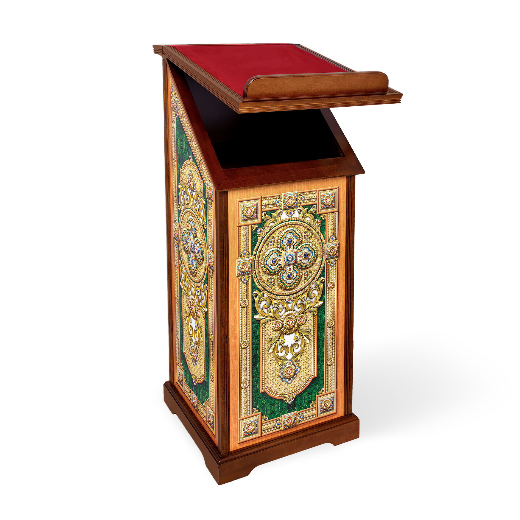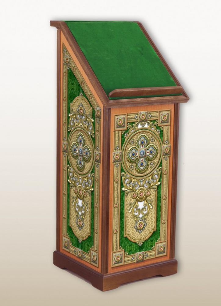 Устойчивый и практичный, тумбовый аналой благородного зеленого цвета, украшенный крестами и геометрическими узорами, идеально подойдет для размещения в храме с лежащей сверху иконой. Высокий деревянный бортик и шершавое тканевое покрытие верха уберегут икону от скольжения и падения. Цвет аналоя можно изменить по желанию заказчика.