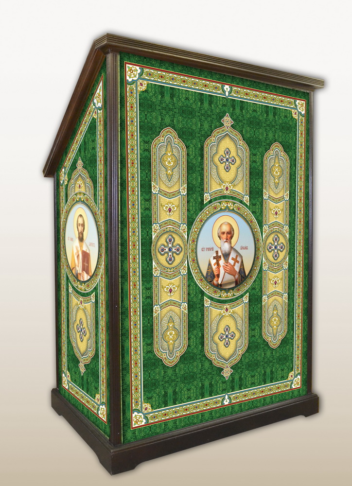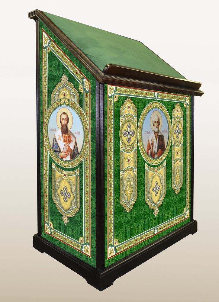 Двойной тумбовый аналой благородного зеленого цвета с иконами святителей на боковых сторонах подойдет на роль центрального аналоя. Высокий деревянный бортик и шершавое тканевое покрытие верха уберегут икону или Евангелие от скольжения и падения.