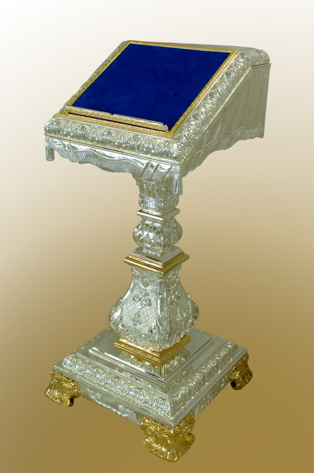 Необычный аналой-пюпитр на устойчивой ножке будет удобен для размещения в алтаре или вдоль стены в храме. Компактная конструкция позволит сэкономить место, а высокий бортик и тканевая поверхность (цвет бархата может быть изменен по пожеланию заказчика) уберегут лежащие на аналое предметы от падения. Тонкие узоры, благородное цветовое сочетание золотых и серебряных оттенков, лаконичная форма – все это делает аналой произведением церковного искусства, достойным размещения в красивейшем кафедральном соборе. Размер нижнего основания, мм : 580 х 580
