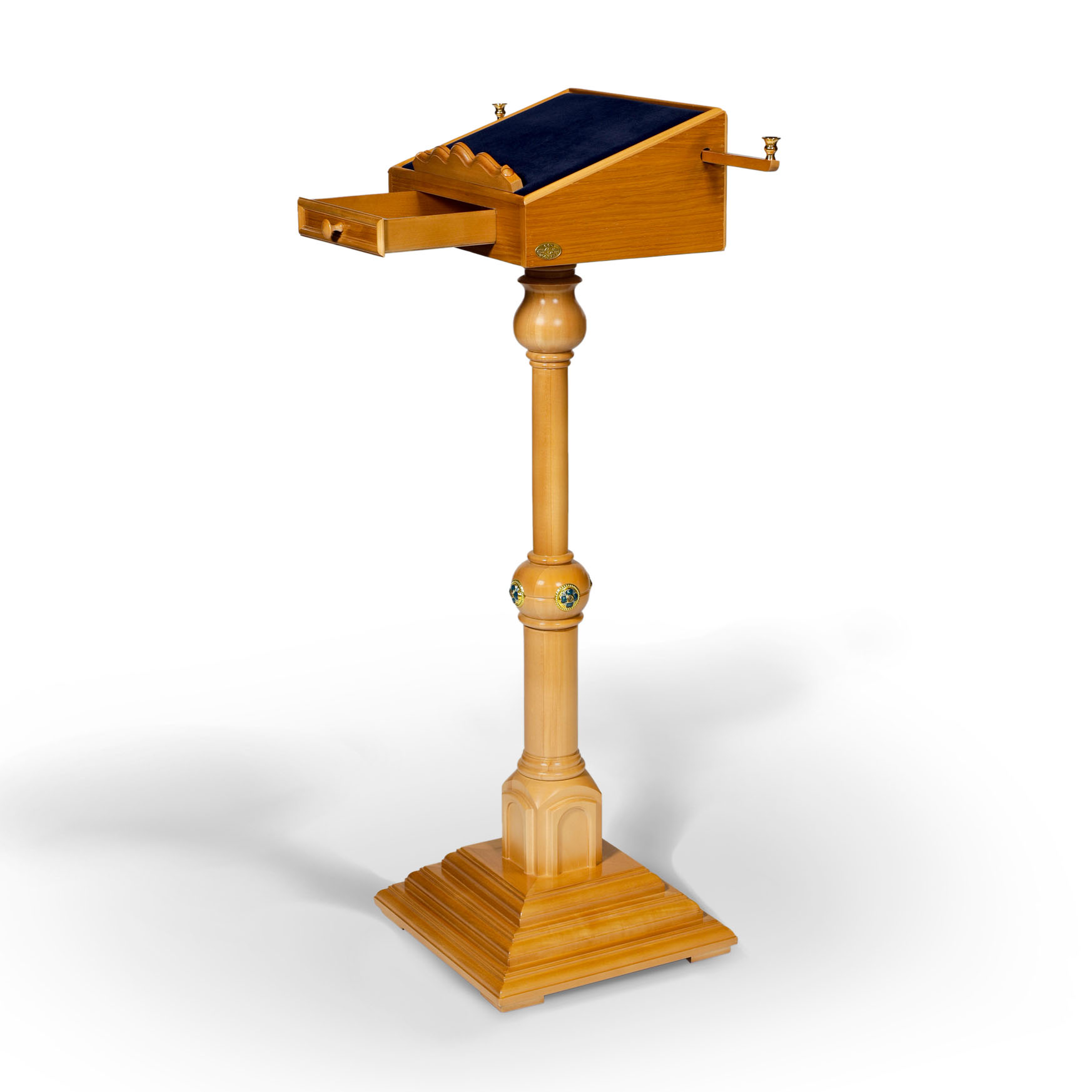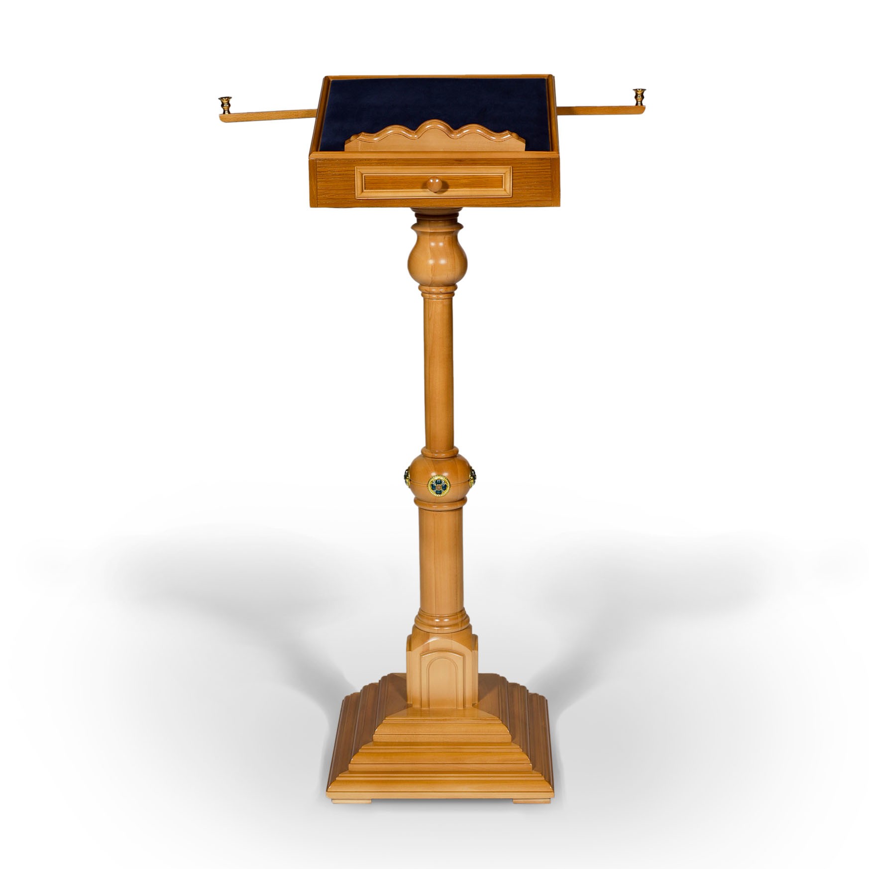 Аналой-пюпитр на устойчивой точеной ножке будет удобен для размещения в алтаре. Компактная конструкция позволит сэкономить место, а высокий деревянный бортик убережет служебник от падения. Также в аналое есть небольшой выдвижной ящик, удобный для хранения мелких предметов.