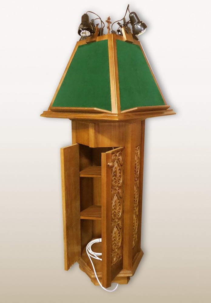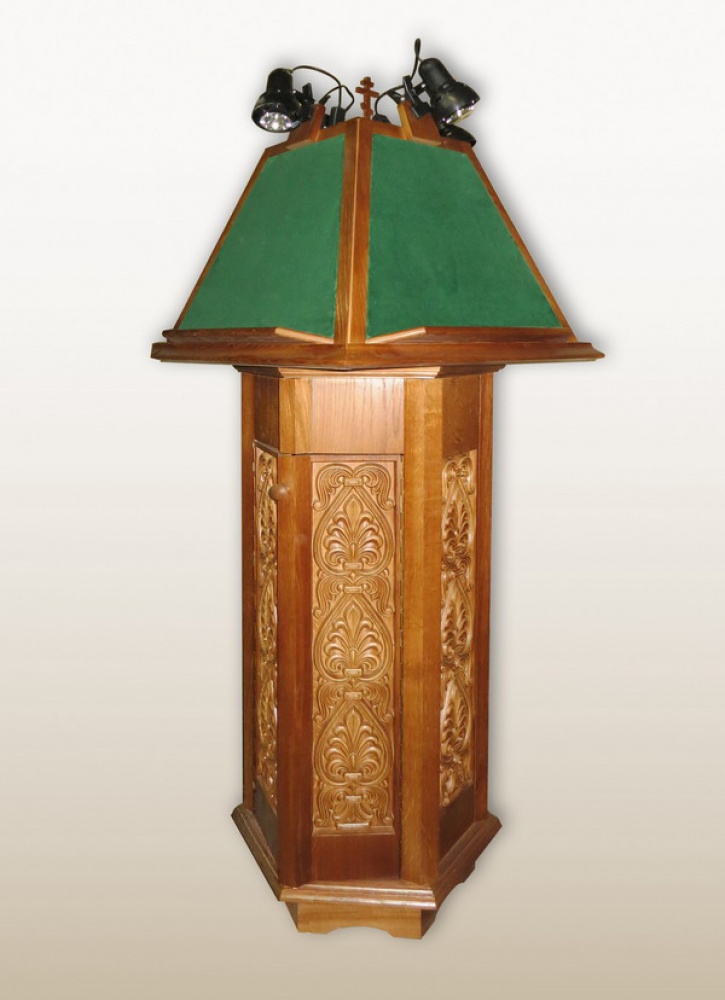 Данная модель аналоя из липы существенно облегчит клиросное служение. 4 рабочие поверхности сделают смену книг и нот комфортной. Благодаря маленькому наклону пюпитров, даже задние ряды певчих смогут увидеть ноты, а на высоком деревянном бортике самые толстые богослужебные книги будут стоять устойчиво. Шершавое бархатное покрытие пюпитров предотвратит скольжение и падение нот. Также к аналою прилагаются 4 светильника для каждого пюпитра, что снизит нагрузку на глаза в темное зимнее время. На четырех вместительных полках внутри аналоя поместятся все необходимые богослужебные книги и ноты. Высота крышки аналоя - 50 см, ширина нижнего основания - 65 см, шиирина верхнего основания - 26 см, ширина полки - 50 см.