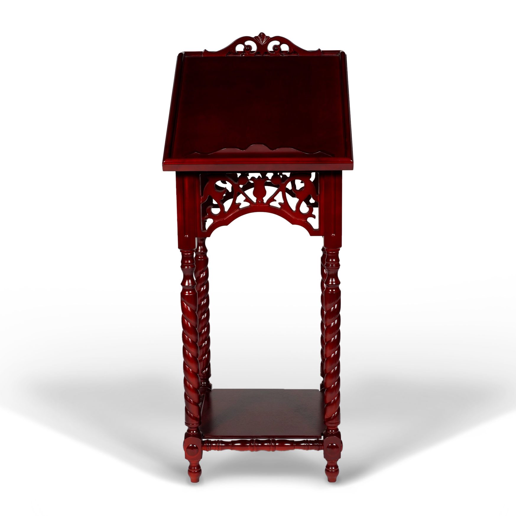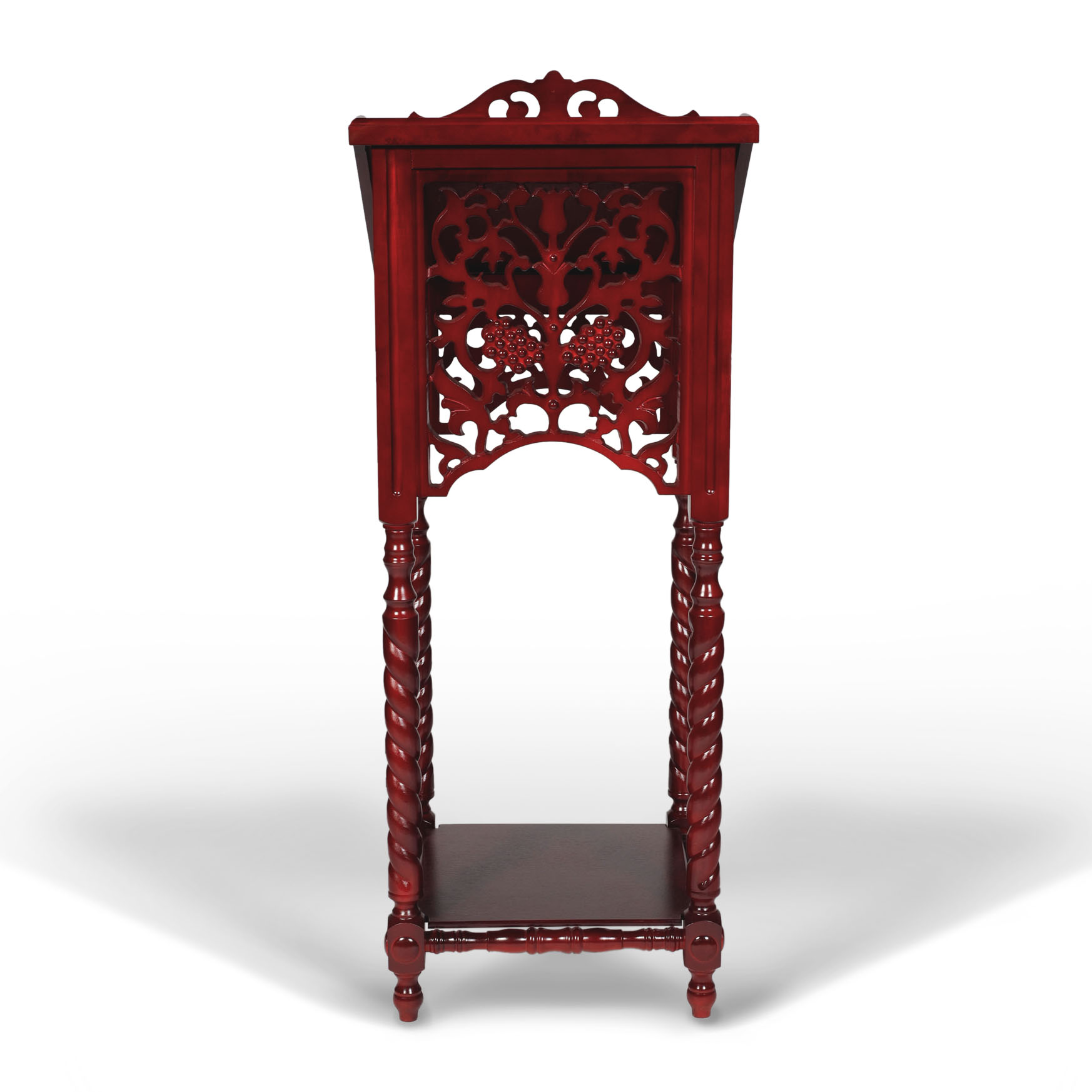 Данная модель аналоя на ножках, украшенная деревянной резьбой, подойдёт на роль центрального аналоя. Компактная конструкция позволит сэкономить место, а высокий деревянный бортик убережет икону от падения. На открытую декоративную полку в нижней части аналоя красиво впишется ваза с цветами.