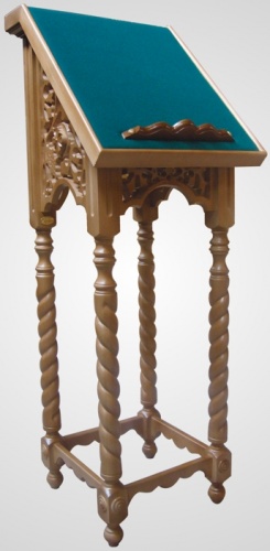 На аналое с витыми ножками благородного цвета темного дерева будет удобно разместить икону в центре или другой части храма. Благодаря высокому деревянному бортику и шершавому тканевому покрытию, икона будет лежать на аналое устойчиво.