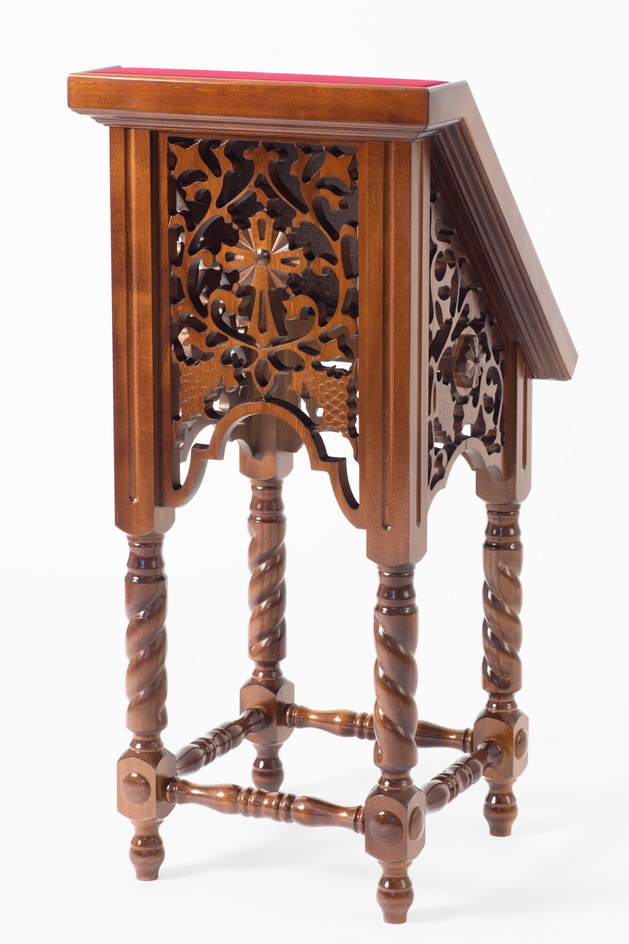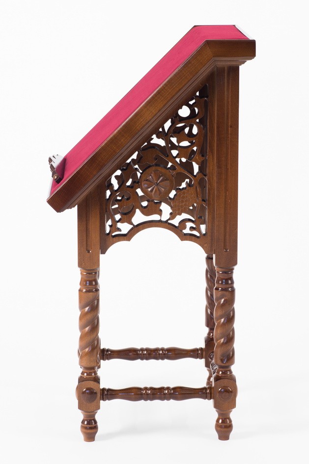 Данная модель аналоя на ножках, украшенная тонкой деревянной резьбой, подойдёт на роль центрального или бокового аналоя. Компактная конструкция позволит сэкономить место, а высокий деревянный бортик убережет икону от падения. Благодаря нейтральному цвету дерева данная модель впишется в интерьер практически любого храма.