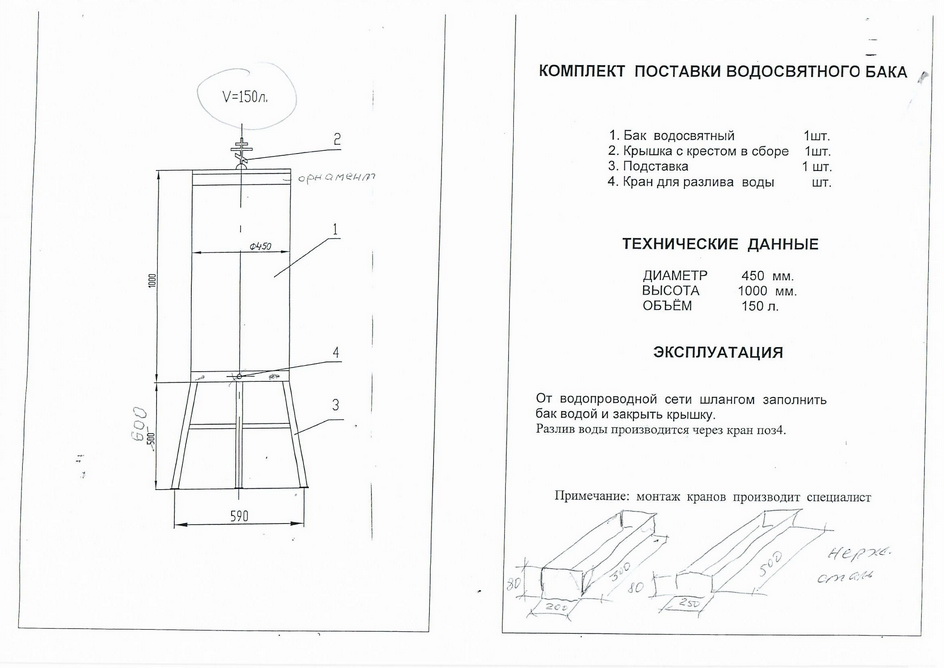 Водосвятный бак сделан из прочной нержавеющей стали. Крышка бака украшена крестом. Подставка высотой 600 мм приподнимает кран на удобную для сбора святой воды высоту. Диаметр бака составляет 450 мм, высота – 1000 мм, объем – 150 л. По желанию заказчика могут быть изменены высота и, соответственно, объем бака, или добавлены декоративные элементы (орнаменты, кресты). Диаметр бака не меняется. Детали изготовленные из латуни можно позолотить. При внесении изменений в изделие цена будет пересчитана.