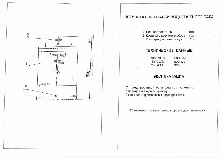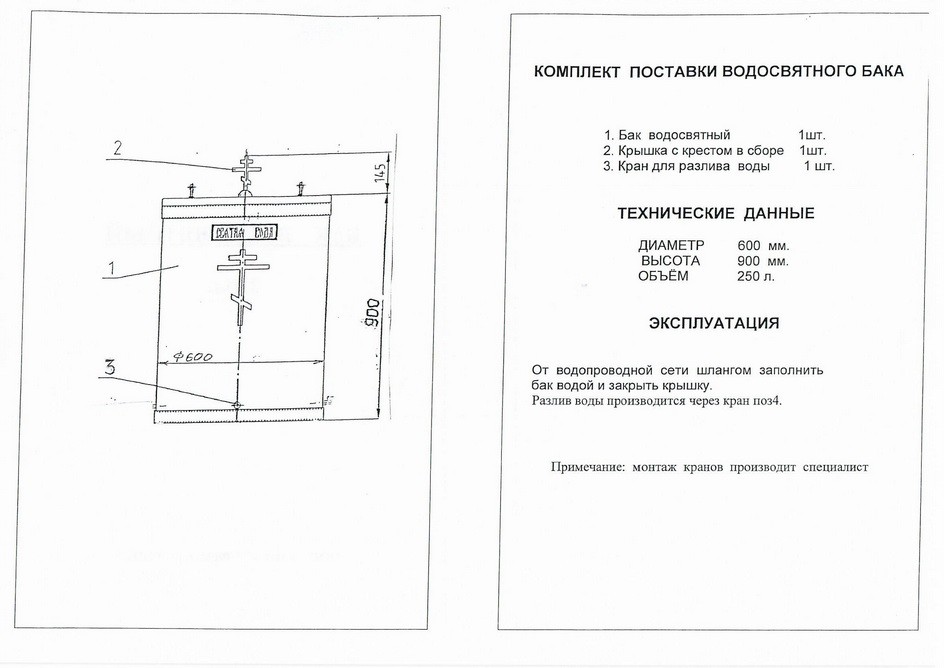 Небольшой водосвятный бак, сделанный из нержавеющей стали, впишется в интерьер абсолютно любого храма. Минимальный декор - кресты на крышке и основании бака – придает изделию благородный вид, но не привлекает к себе лишнего внимания молящихся. Диаметр бака составляет 600 мм, высота – 800 мм, объем – 250 л, а вес – 30 кг. По желанию заказчика могут быть изменены декор или объем бака за счет увеличения высоты. Диаметр бака не меняется. Детали изготовленные из латуни можно позолотить. При внесении изменений в изделие цена будет пересчитана.