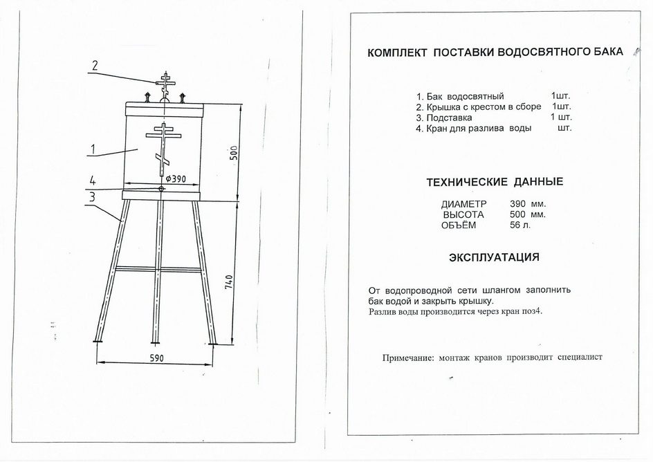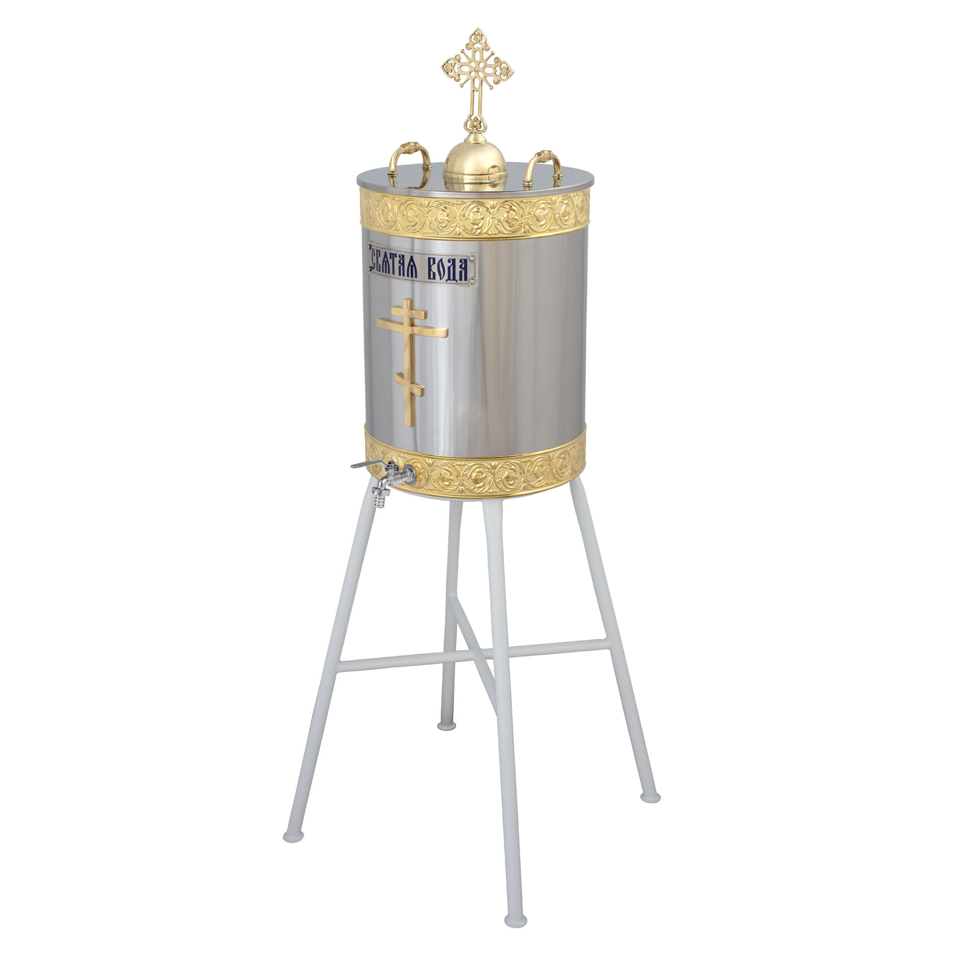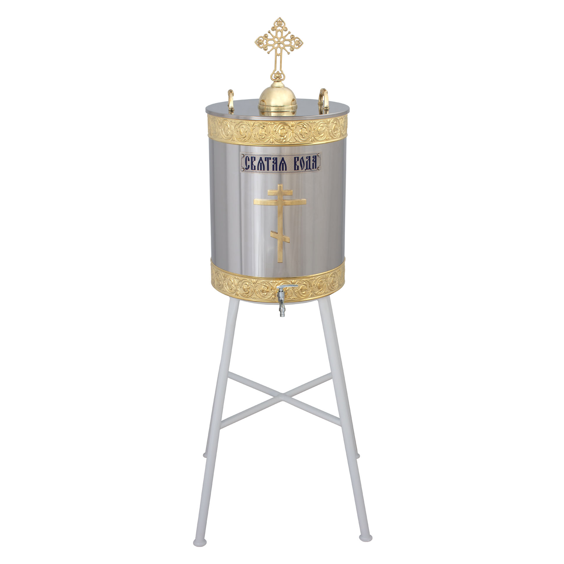 Водосвятный бак из нержавеющей стали состоит из бака, украшенного крестом, крышки с крестом в сборе, подставки высотой 740 мм и крана для разлива воды. Диаметр бака составляет 390 мм. По пожеланию заказчика могут быть изменены высота и, соответственно, объем бака. Так при высоте 500 мм объем бака будет составлять 56 л. Диаметр бака не меняется. Детали изготовленные из латуни можно позолотить. При внесении изменений в изделие цена будет пересчитана.