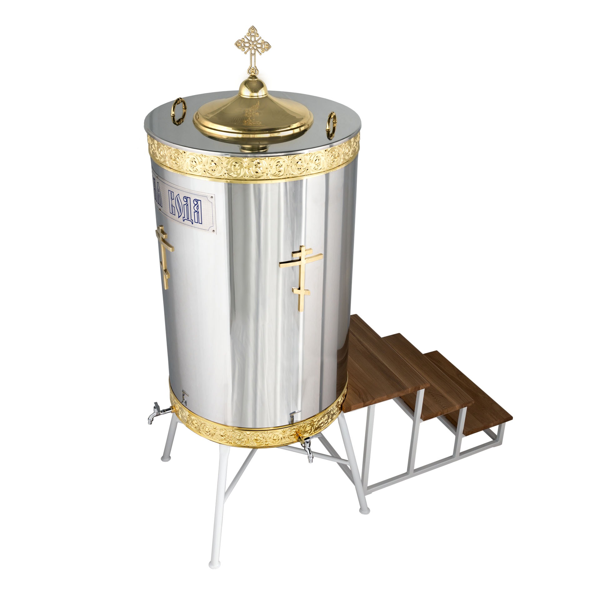 Данная модель водосвятного бака будет удобна для использования в день Крещения Господня. Благодаря трехступенчатой подставке священник любого роста сможет освятить крестом воду внутри бака, высота которого вместе с подставкой состовляет 2200 мм. Диаметр бака составляет 790 мм, высота – 1250 мм, а объем – 600 л. Вес бака - 36,1 кг Вес крышки - 6,2 кг, Вес подставки - 12,3 кг, Вес ступеней - 33,2 кг. Общий вес - 87,8 кг