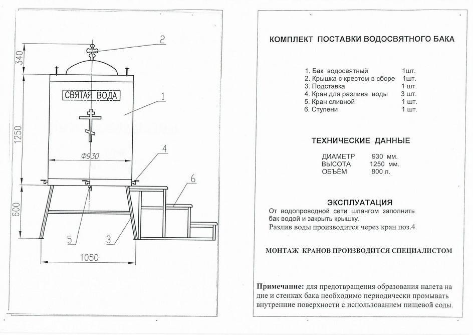 Детали изготовленные из латуни можно позолотить.Большой водосвятный бак, сделанный из нержавеющей стали и украшенный крестом и надписью «Святая вода», подойдет для использования в многолюдном храме в день Крещения Господня. Подставка высотой 600 мм поднимает бак от земли и делает наливание из крана святой воды более комфортным для прихожан. Чтобы священник мог освятить воду внутри бака, к изделию прилагается устойчивая трехступенчатая подставка. Диаметр бака составляет 930 мм, высота – 1250 мм, а объем – 800 л. По желанию заказчика могут быть изменены декор или объем бака за счет увеличения высоты. Диаметр бака не меняется. Детали изготовленные из латуни можно позолотить. При внесении изменений в изделие цена будет пересчитана.