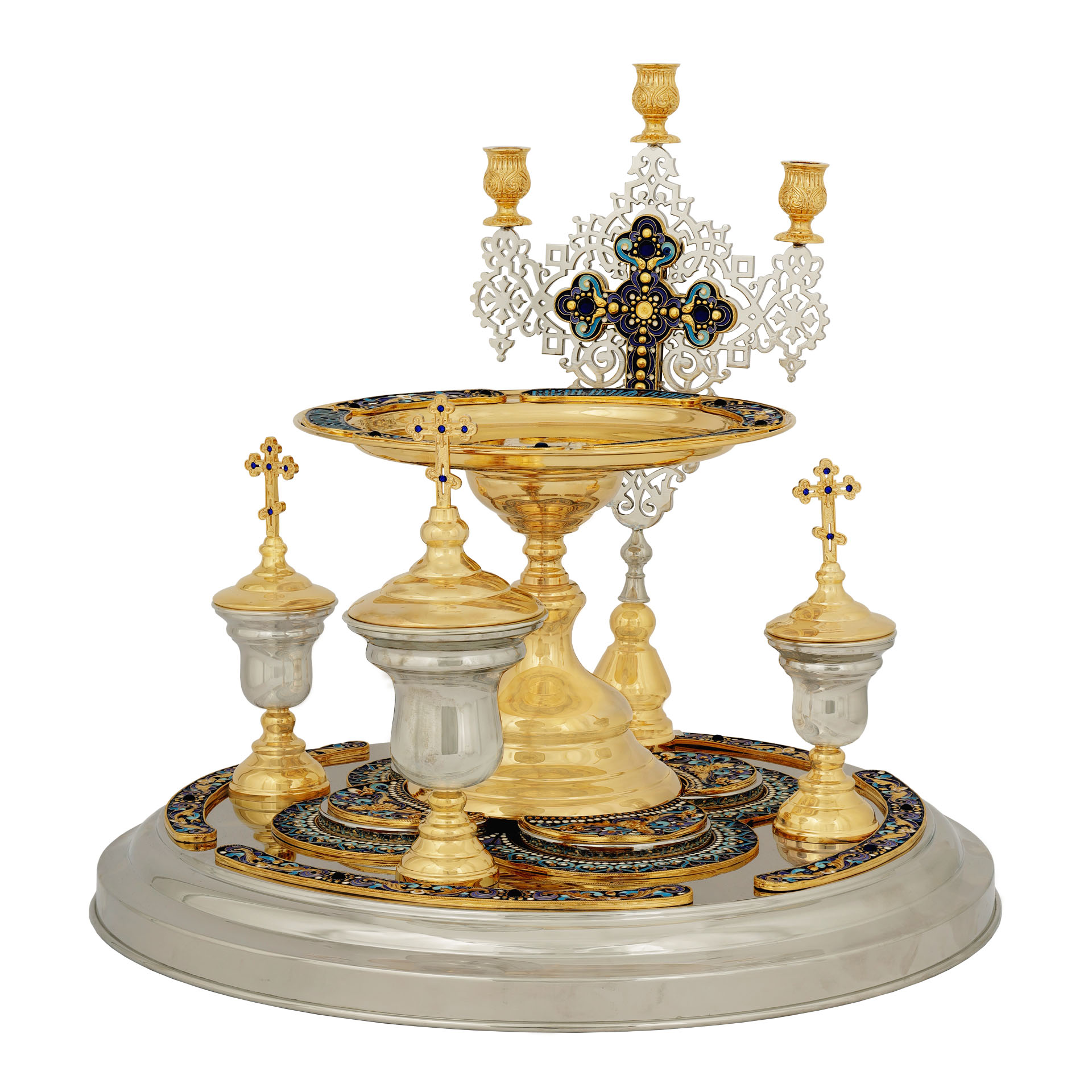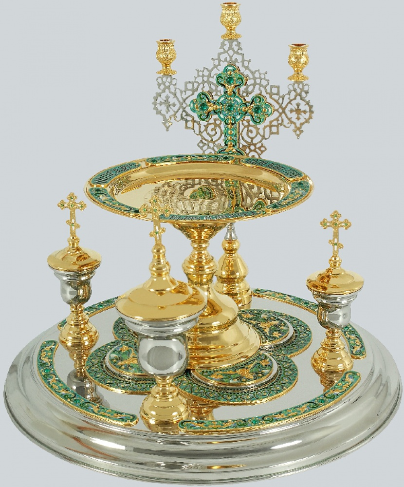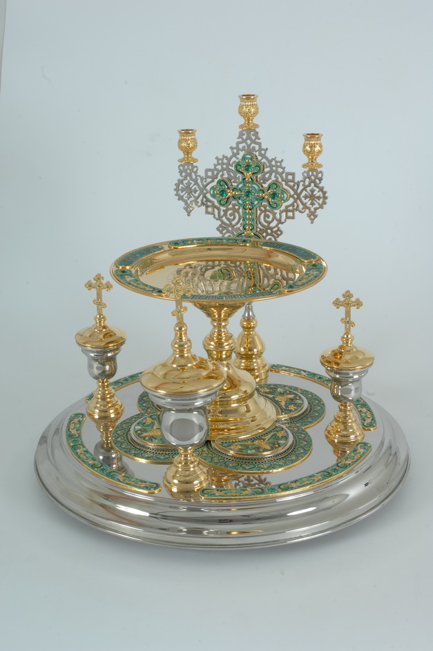 К всенощному блюду прилагаются мельхиоровые вкладыши объемом 50 и 150 мл. Желаемый цвет эмали необходимо указать в комментарии к заказу.
