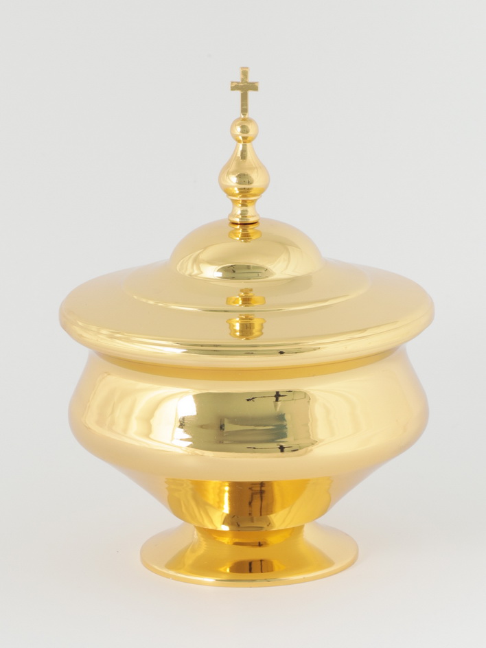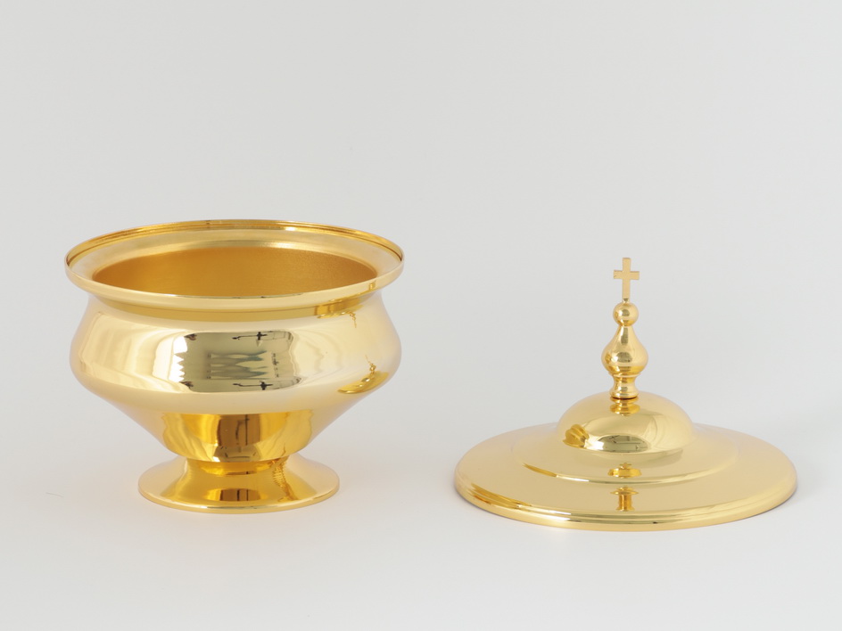 Необычная чаша для святых частиц в форме горшка выполнена из меди и латуни. Покрытая позолотой и украшенная крестом, она обладает вместимостью до 0,5 л. Такого объема хватит для праздничной службы в храме среднего размера.