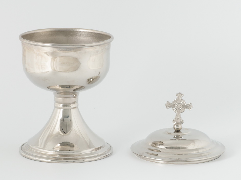 Благодаря универсальному дизайну, минималистичная чаша для святых частиц впишется в интерьер любого храма. Сделаная из латуни и покрытая никелем, она обладает вместимостью до 0,5 л. Такого объема хватит для праздничной службы в храме среднего размера. Крышка чаши украшена крестом.