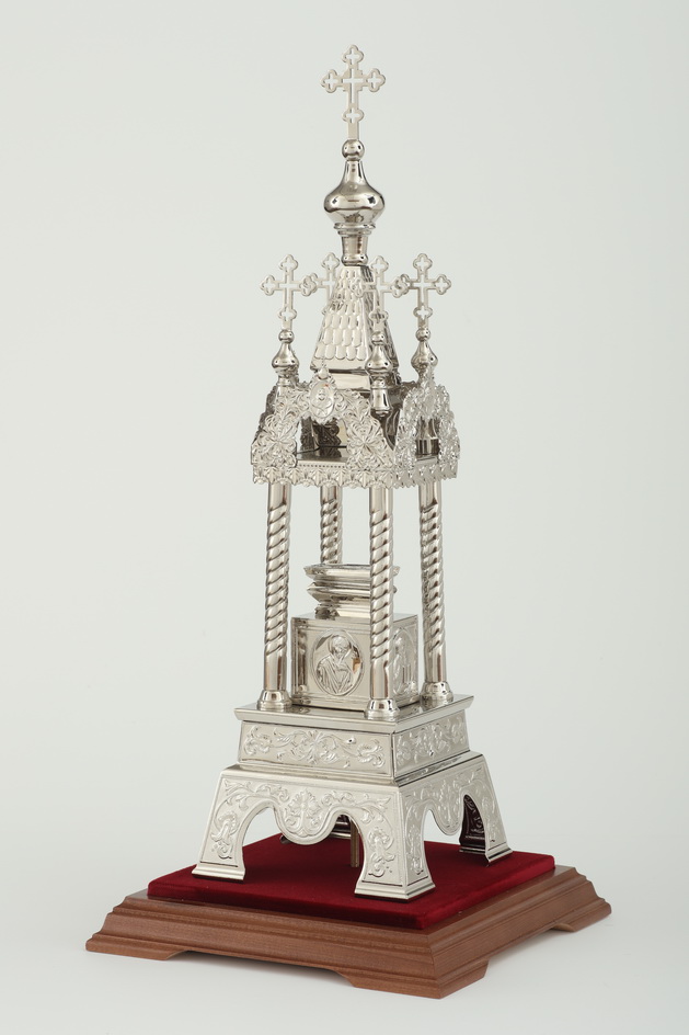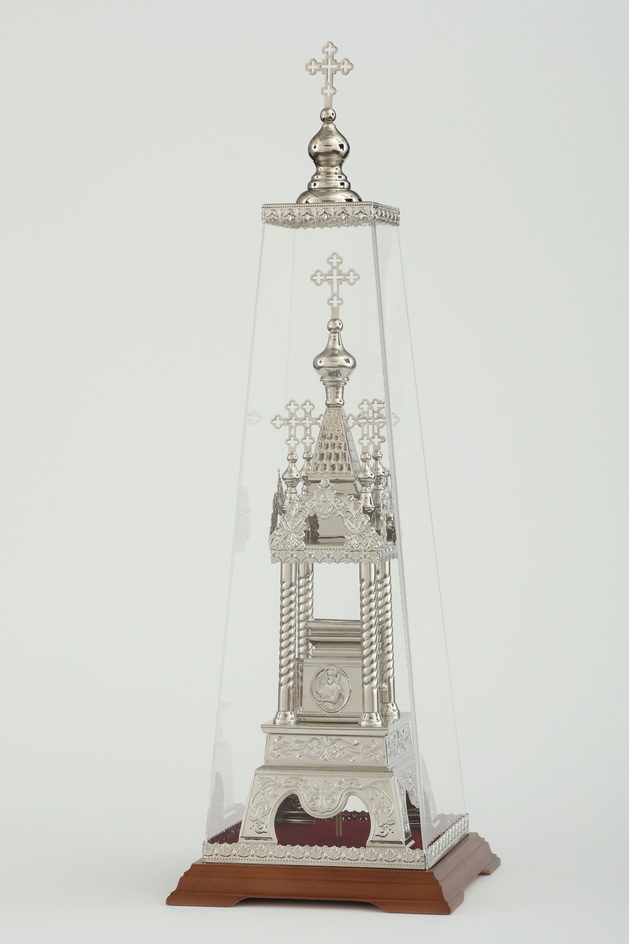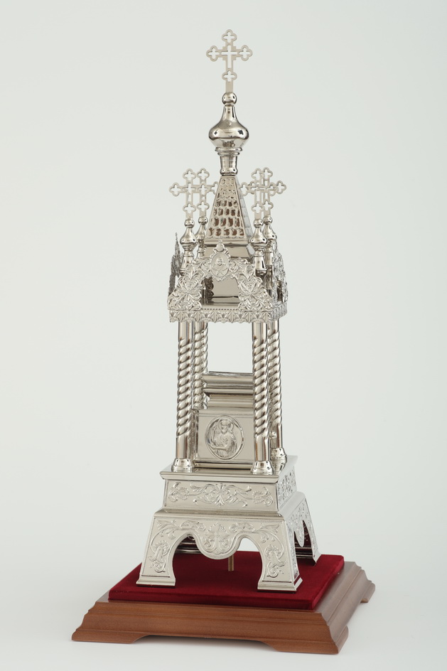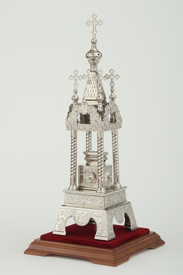 Дарохранительница, выполненная из латуни и покрытая никелем, станет достойным местом для хранения Святых Даров. Серебряный цвет дарохранительницы красиво сочетается с ореховым цветом деревянной подставки, обитой бордовым бархатом. Дарохранительница выполнена в форме часовни, купол которой увенчан пятью крестами, а стены украшены геометрическими и растительными орнаментами. Колпак из органического стекла защитит дарохранительницу от повреждений и пыли.