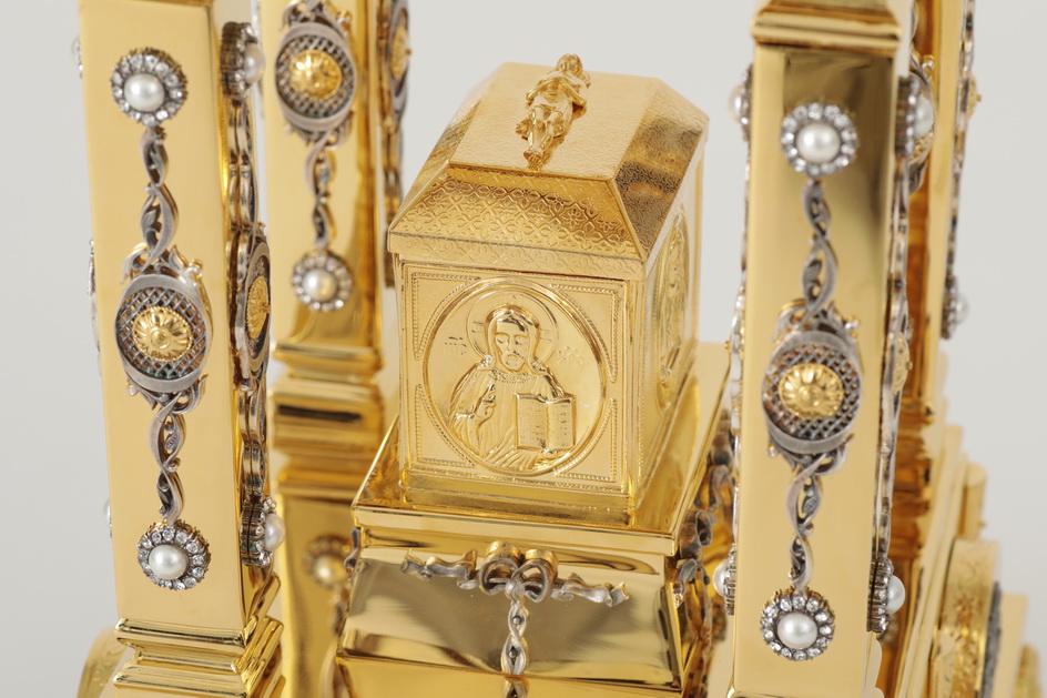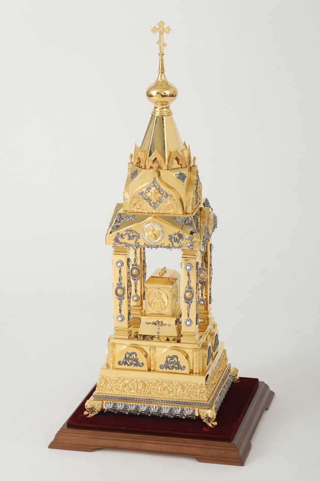 Торжественная дарохранительница в форме часовни станет достойным местом для хранения Святых Даров. Верх часовни увенчан крестом, а в центре часовни находится ящичек для Святых Даров, украшенный золотой плащаницей. Сочетание золотых и серебряных оттенков, изящные литьевые накладки с узорами, деревянная подставка, обитая бархатом – все это делает дарохранительницу настоящим произведением церковного искусства. Колпак из органического стекла защищает дарохранительницу от повреждений и пыли.