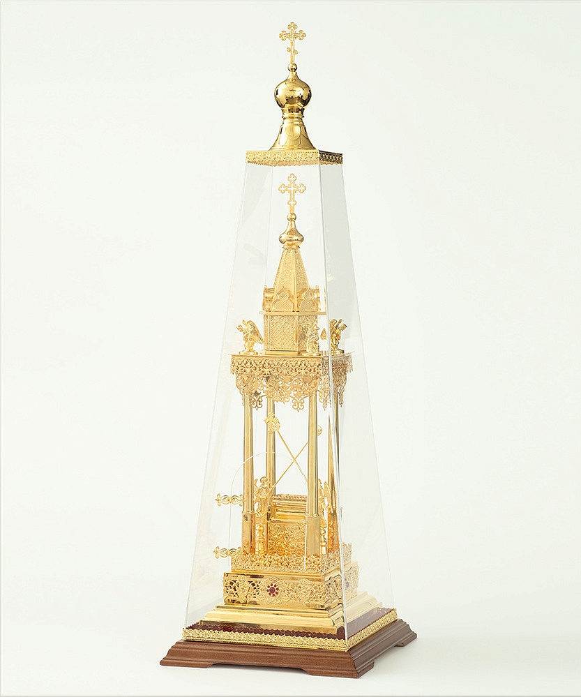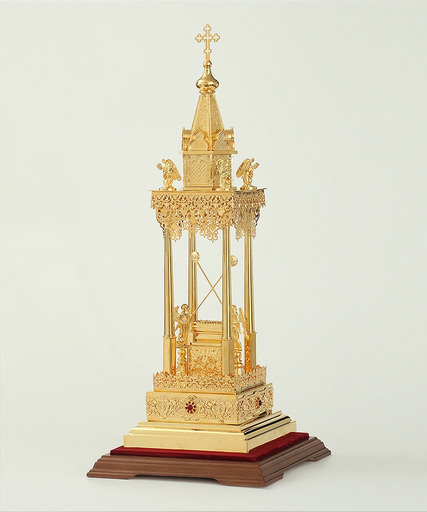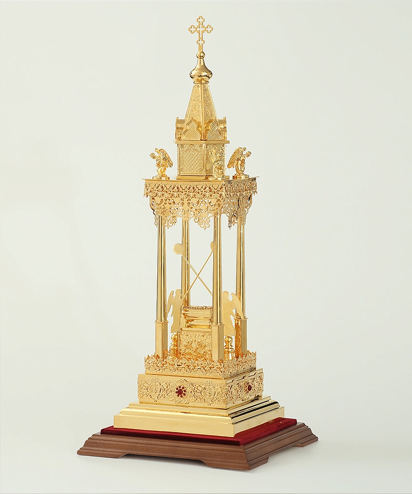 Золотая дарохранительница в форме часовни станет достойным местом для хранения Святых Даров. Верх часовни увенчан крестом и двумя парящими ангелами. В центре часовни находится ящичек для Святых Даров, возле которого стоят два ангела с рипидами в руках. Колпак из органического стекла, оборудованный удобной дверцей, защитит дарохранительницу от повреждений и пыли. Золотой цвет дарохранительницы красиво сочетается с ореховым цветом деревянной подставки, обитой бордовым бархатом.