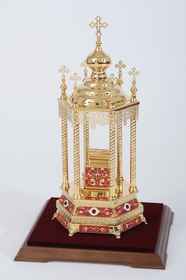 Нарядная дарохранительница в форме часовни станет достойным местом для хранения Святых Даров. Основание часовни и ящичек для Святых Даров украшены яркими эмалевыми узорами, которые могут быть выполнены в красном, синем и зеленом цветах. Купол часовни увенчан пятью крестами, символизирующими победу Христа. Колпак из органического стекла защитит дарохранительницу от повреждений и пыли.