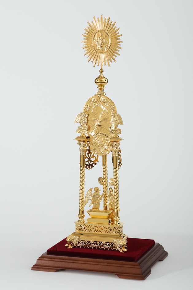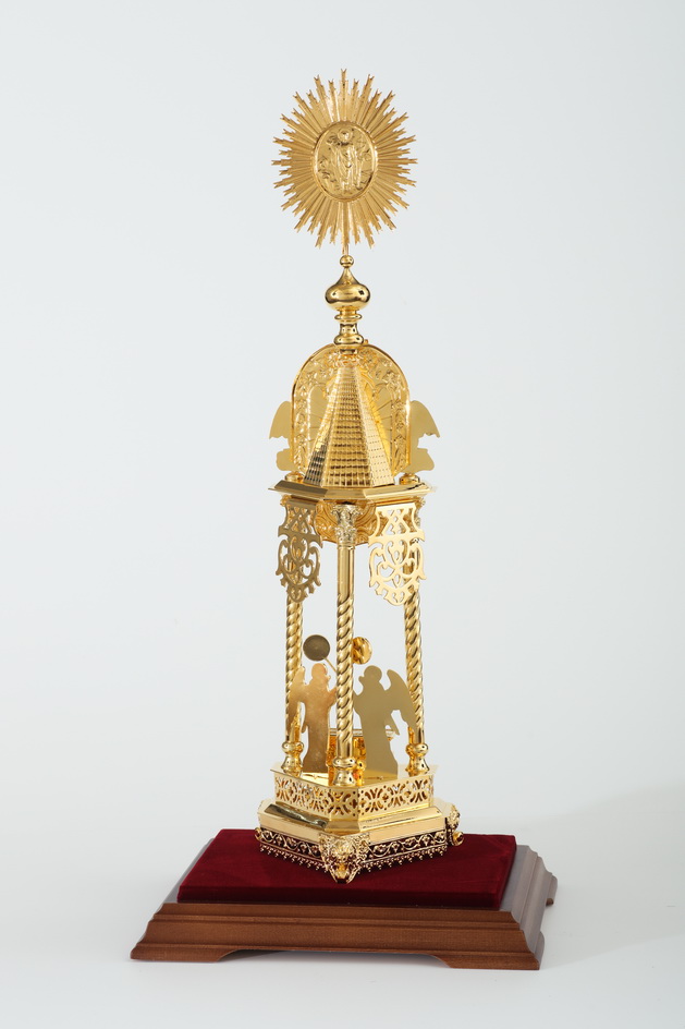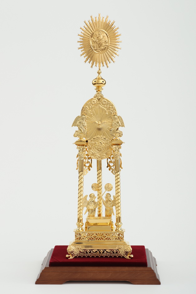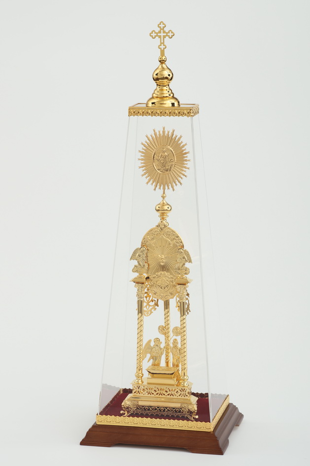 Дарохранительница, выполненная из латуни и покрытая золотом, станет достойным местом для хранения Святых Даров. Золотой цвет дарохранительницы красиво сочетается с ореховым цветом деревянной подставки, обитой бордовым бархатом. Дарохранительница украшена литыми геометрическими орнаментами, иконой Христова Воскресения, фигурами двух парящих и двух ангелов с рипидами в руках. Колпак из органического стекла защитит дарохранительницу от повреждений и пыли.