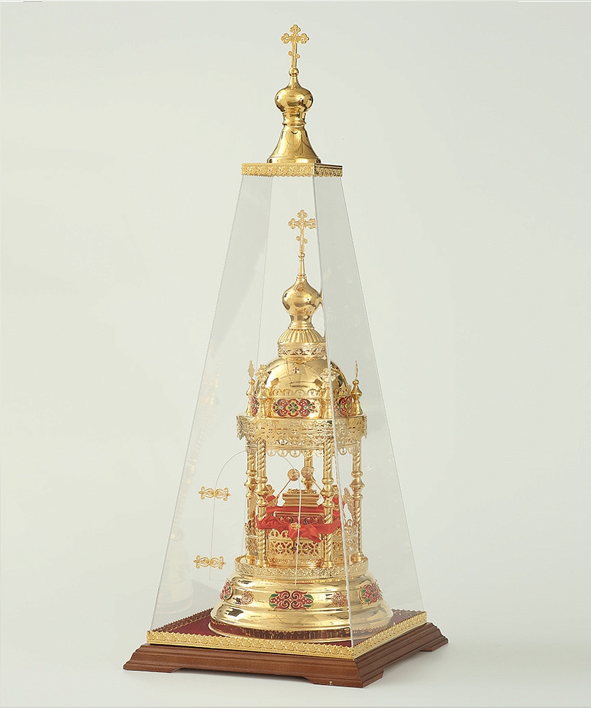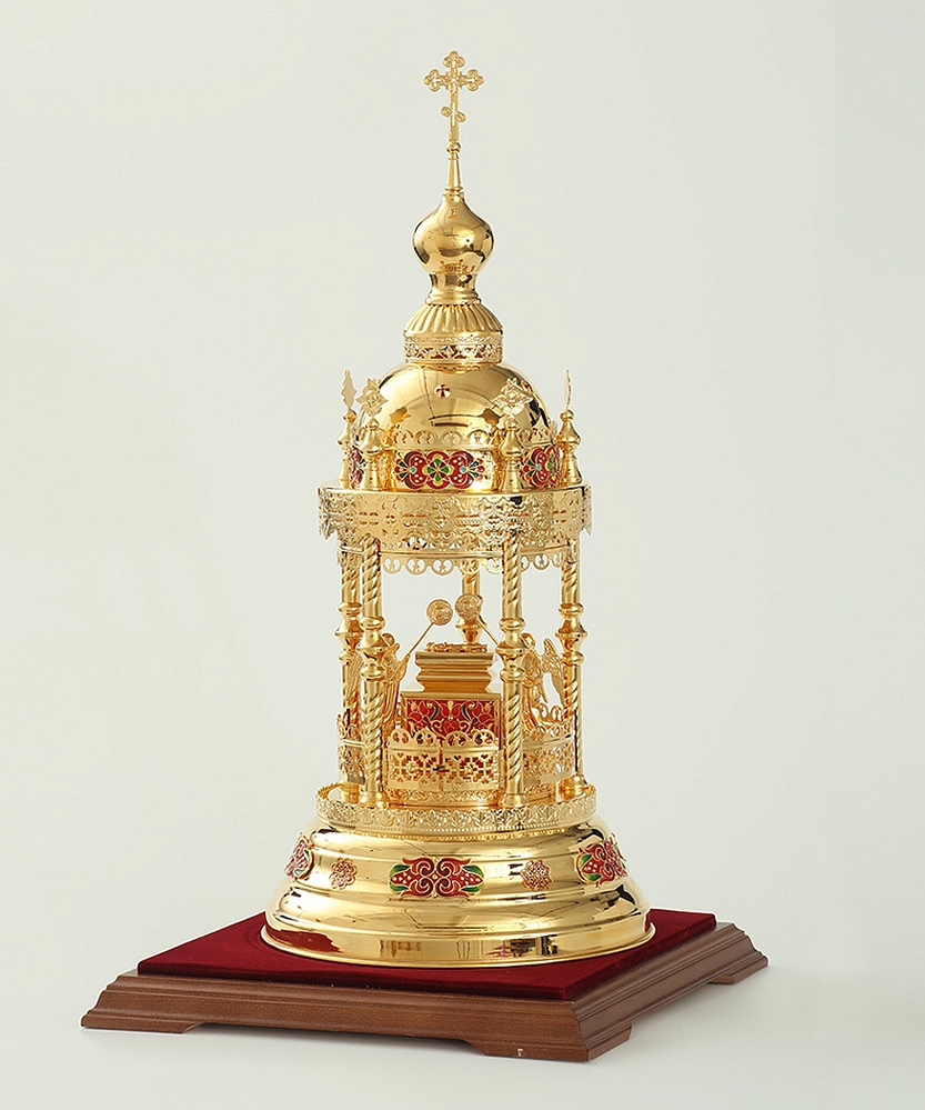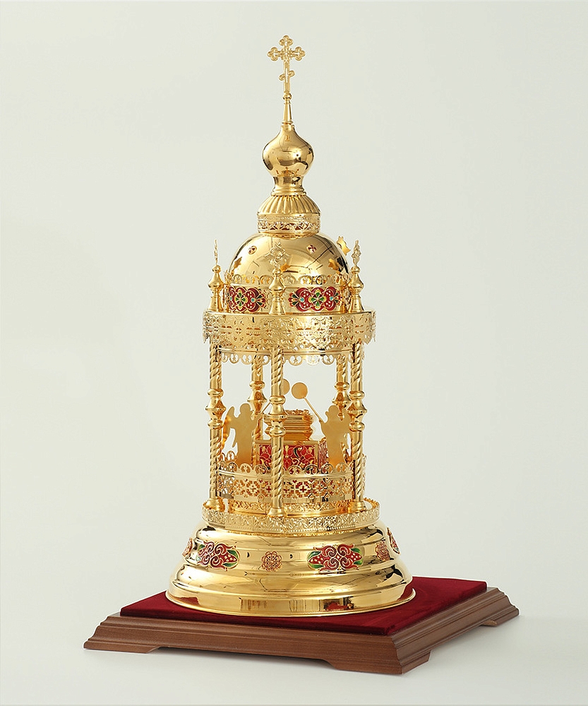 Золотая дарохранительница в форме круглой часовни станет достойным местом для хранения Святых Даров. Верх часовни увенчан крестом и парящими ангелами. В центре часовни находится ящичек для Святых Даров, возле которого стоят два ангела с рипидами в руках. Яркие эмалевые узоры, которые могут быть выполнены в синем, красном и зеленых цветах, и сияющие камни добавляют дарохранительнице праздничной торжественности. Колпак из органического стекла защищает дарохранительницу от повреждений и пыли.