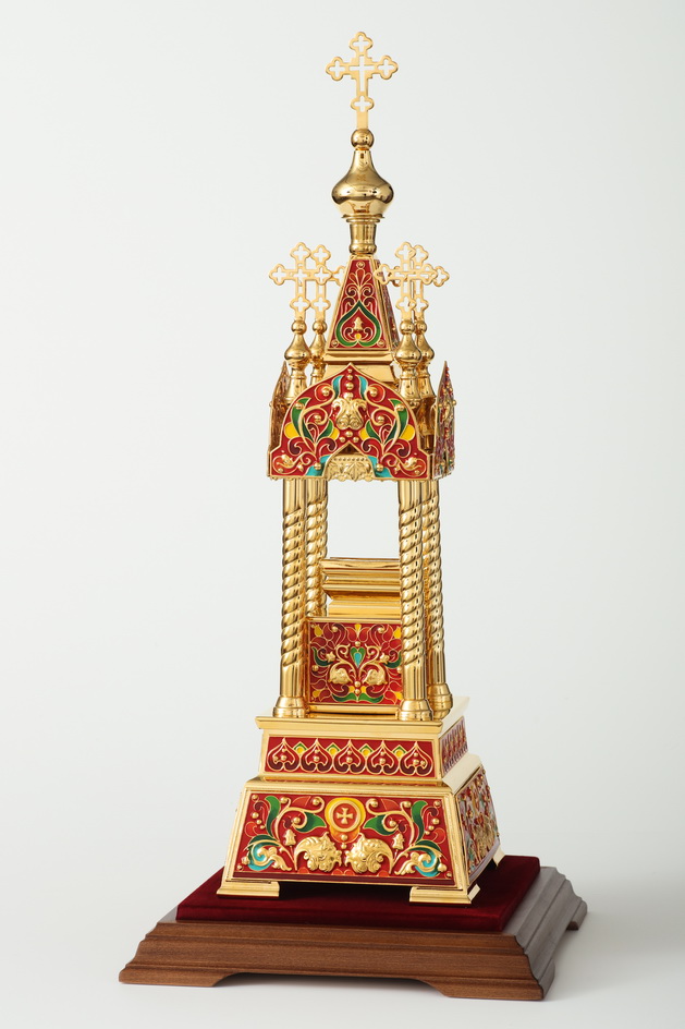 Необычная дарохранительница, выполненная из латуни и меди, станет достойным местом для хранения Святых Даров. Дарохранительница сделана в форме часовни, увенчанной пятью крестами. Стены часовни украшены яркими геометрическими и растительными эмалевыми узорами, напоминающими о райском саде. Колпак из органического стекла защитит дарохранительницу от повреждений и пыли. Золотой цвет дарохранительницы красиво сочетается с ореховым цветом деревянной подставки, обитой бордовым бархатом. Цвет эмали может быть изменен по желанию заказчика.