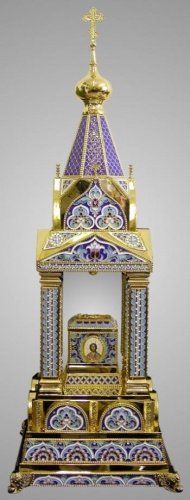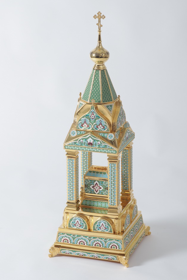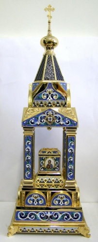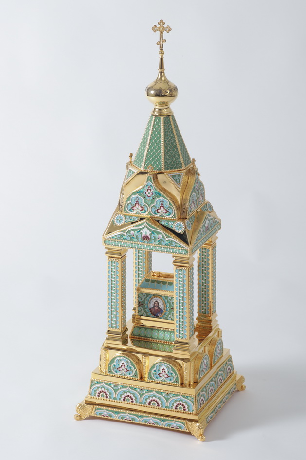 Благородная дарохранительница в форме квадратной часовни станет достойным местом для хранения Святых Даров. Верх часовни увенчан крестом, а в центре часовни находится ящичек для Святых Даров, украшенный иконами, выполненными в технике финифть. Дарохранительница украшена тонкой филигранью и многочисленными геометрическими эмалевыми узорами, которые ярко выделяются на золотом фоне. Цвет эмали может быть любым по пожеланию заказчика.
