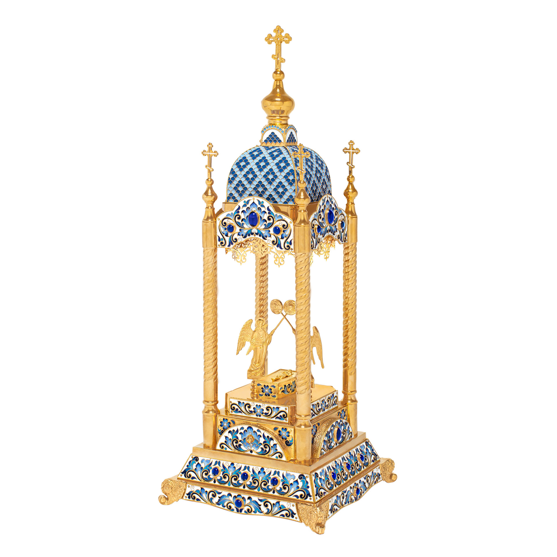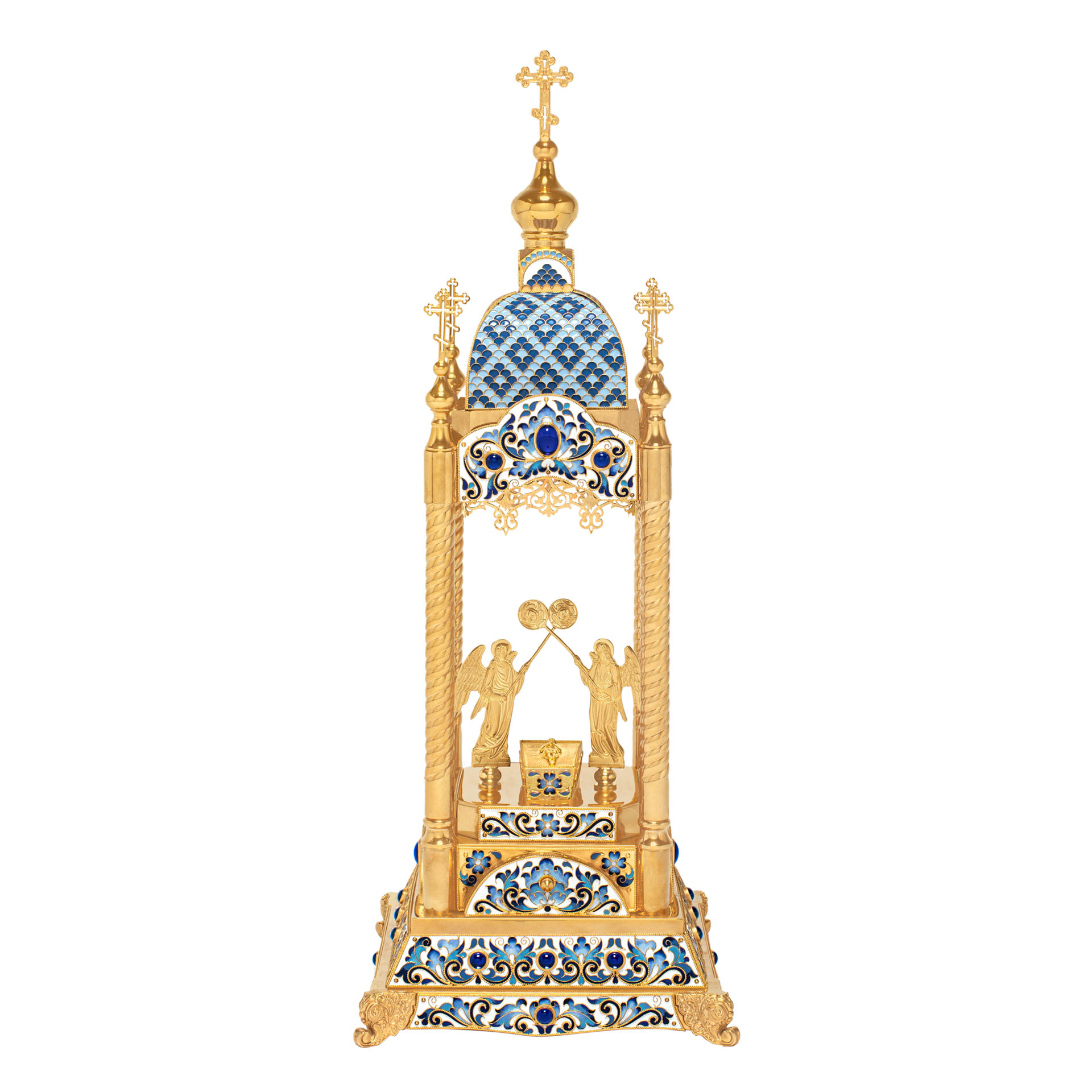 Яркая дарохранительница в форме вытянутой часовни станет достойным местом для хранения Святых Даров. Верх часовни увенчан пятью крестами, а в центре часовни находится ящичек для Святых Даров, возле которого стоят два ангела с рипидами в руках. Дарохранительница украшена многочисленными геометрическими эмалевыми узорами и тонкой филигранью.