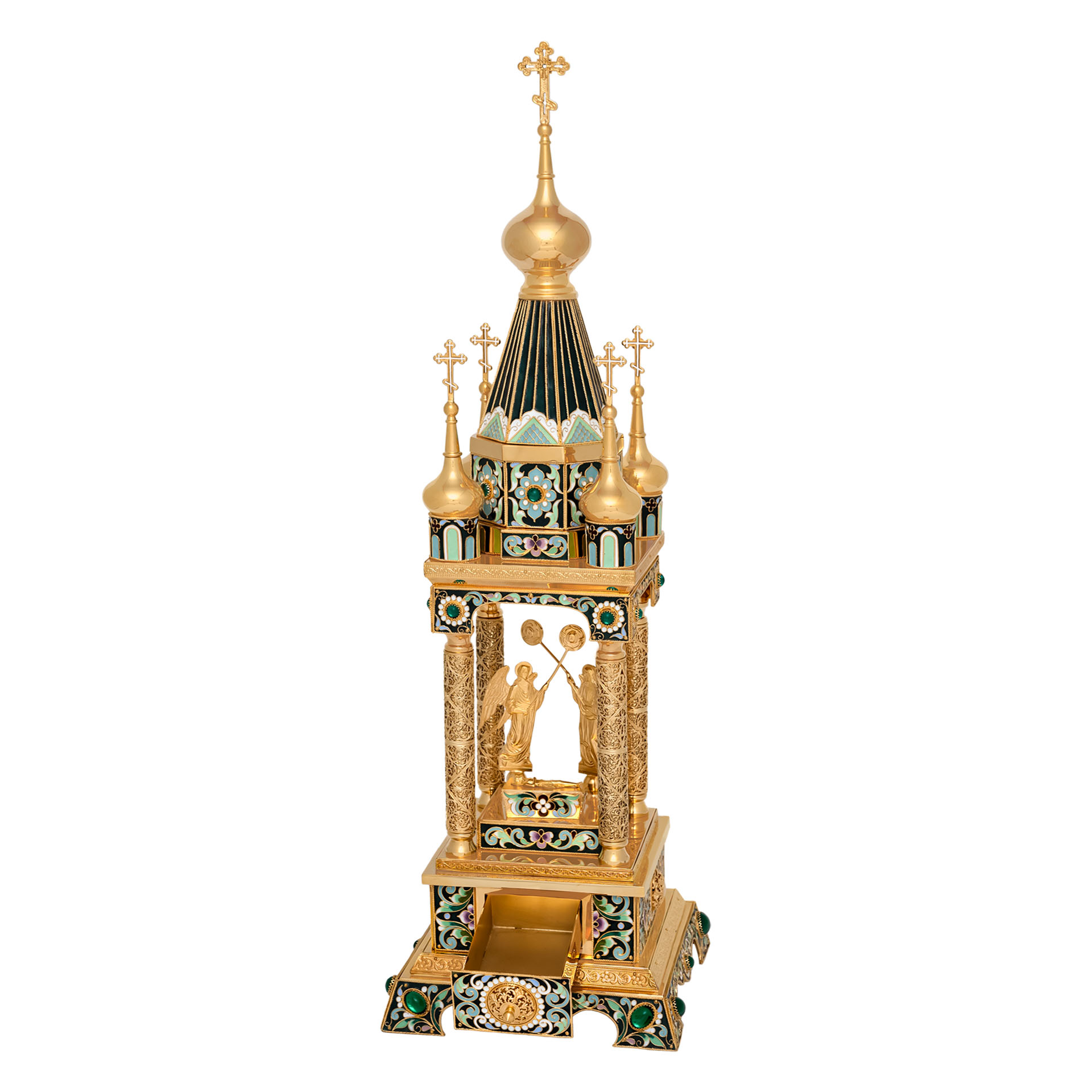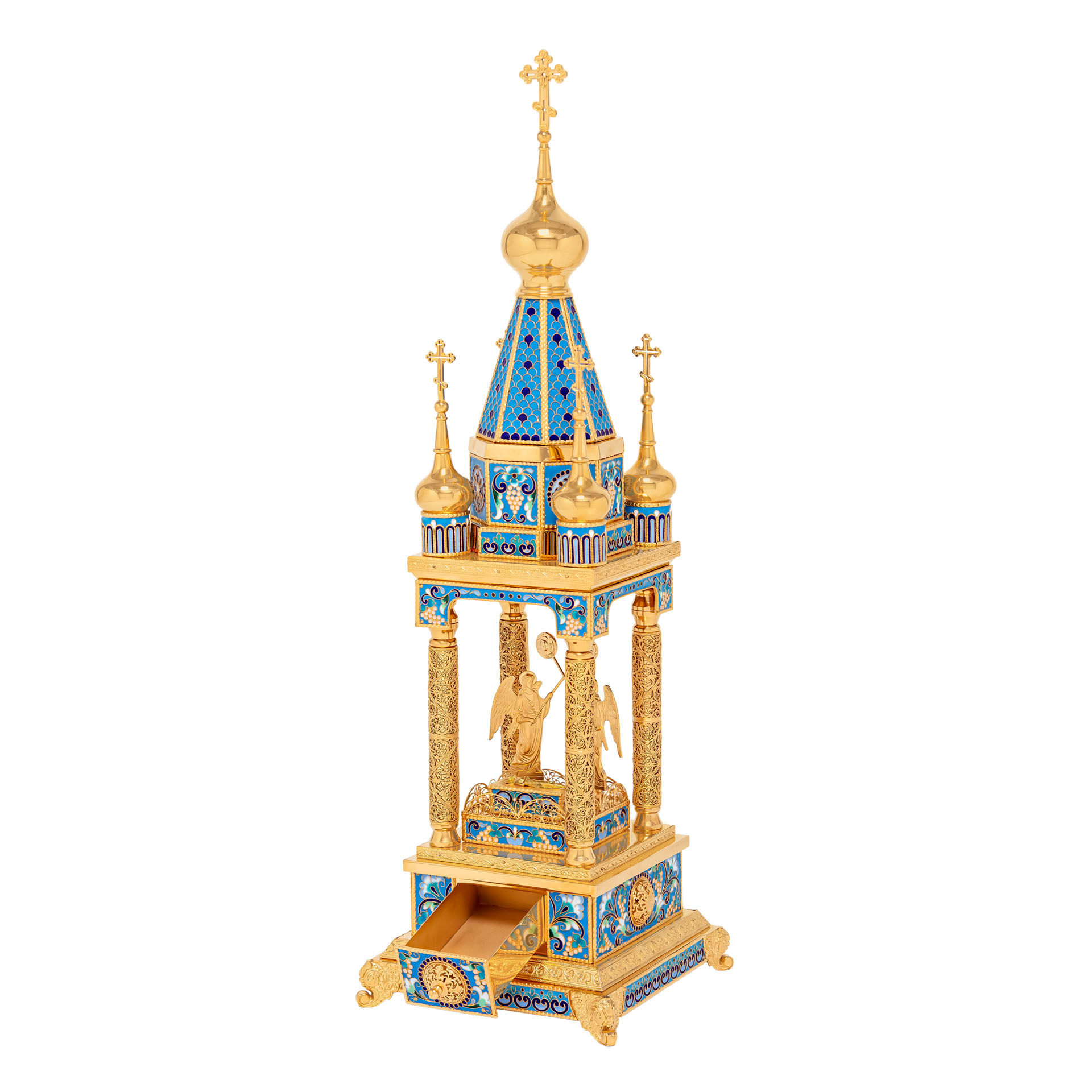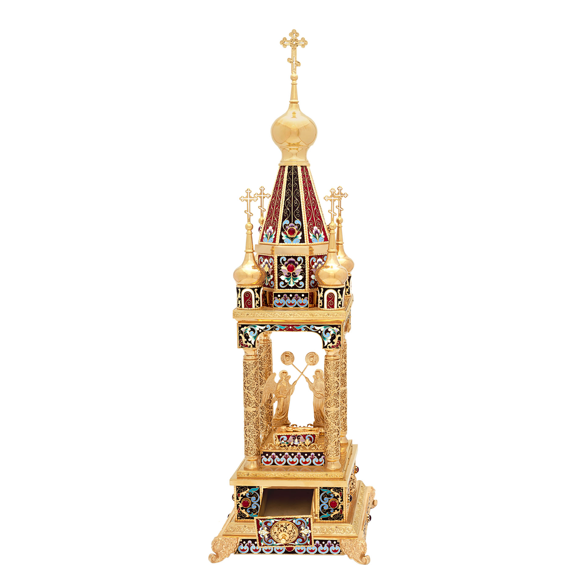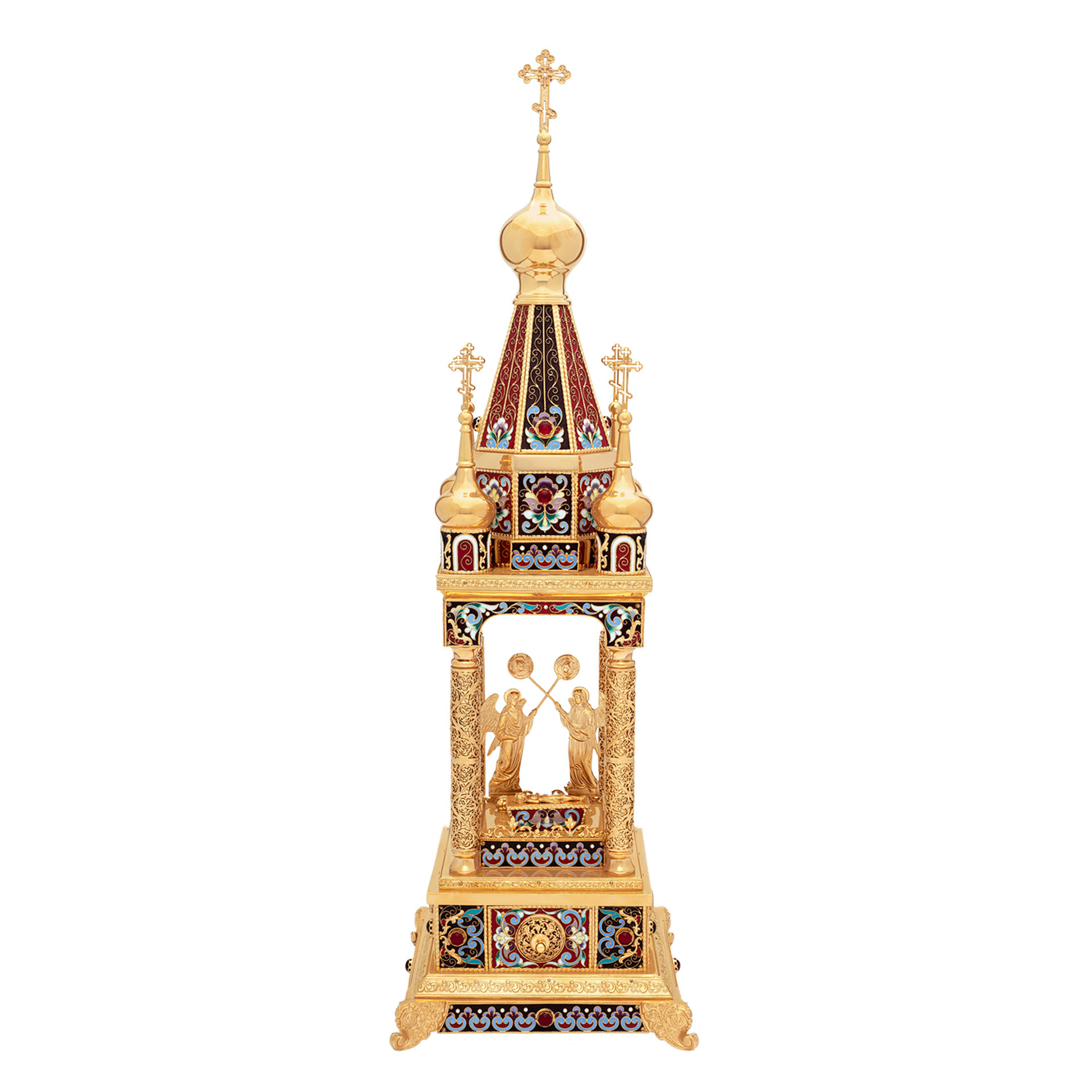 Благородная дарохранительница в форме часовни станет достойным местом для хранения Святых Даров. Верх часовни увенчан пятью крестами, а в центре часовни находится ящичек для Святых Даров, возле которого стоят два ангела с рипидами в руках. Дарохранительница украшена многочисленными геометрическими узорами, цветной эмалью, сияющими камнями, изящной финифтью и тонкой филигранью.