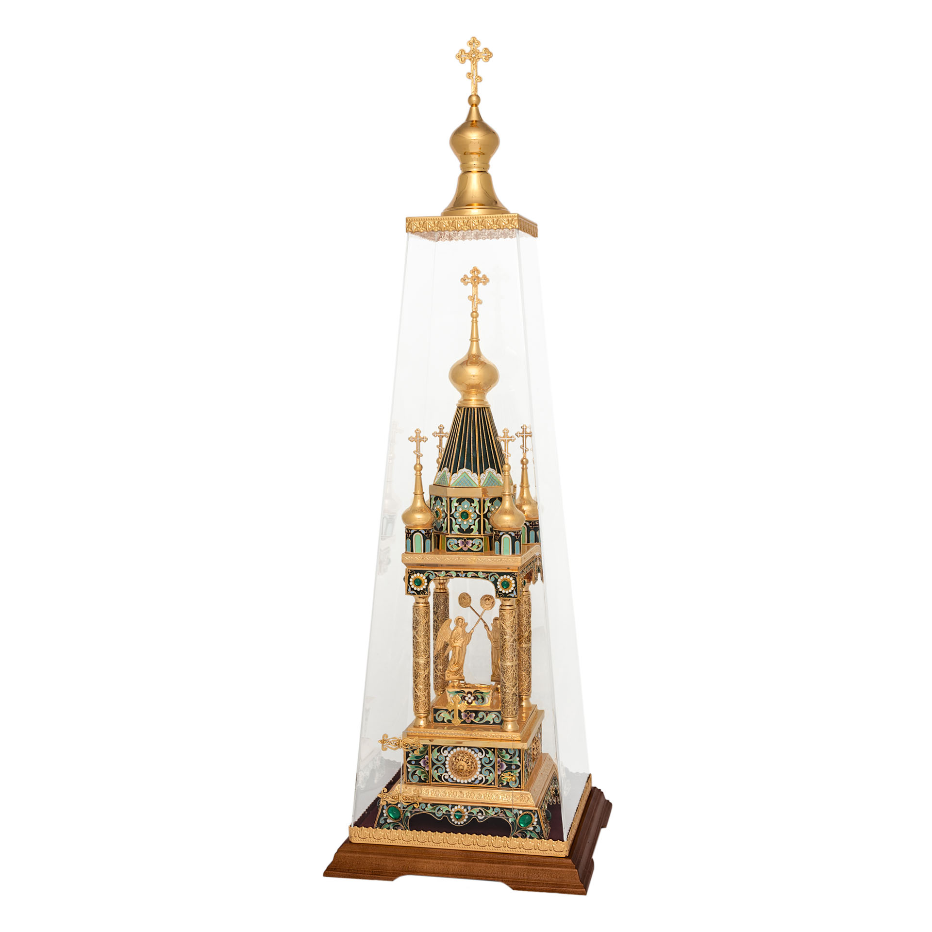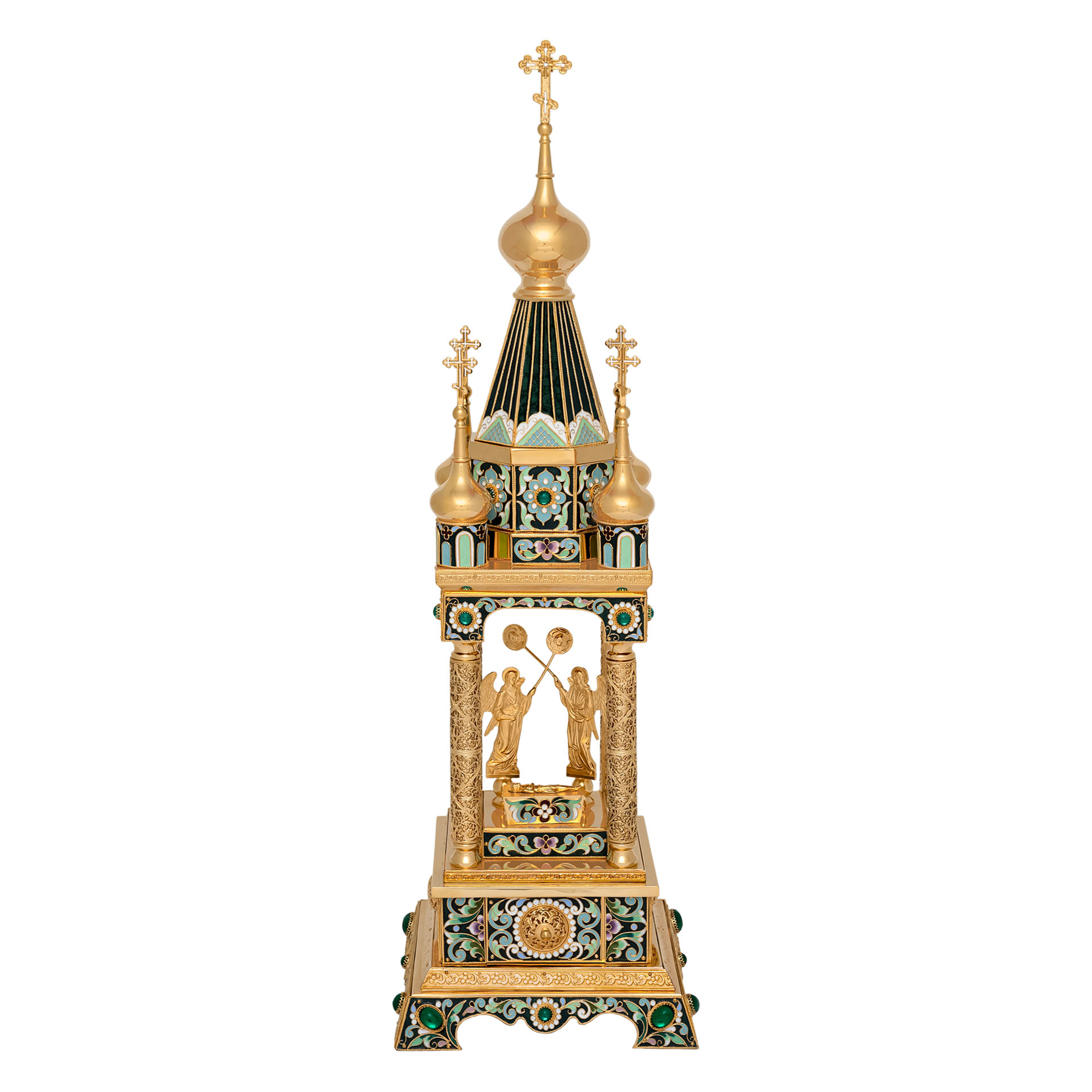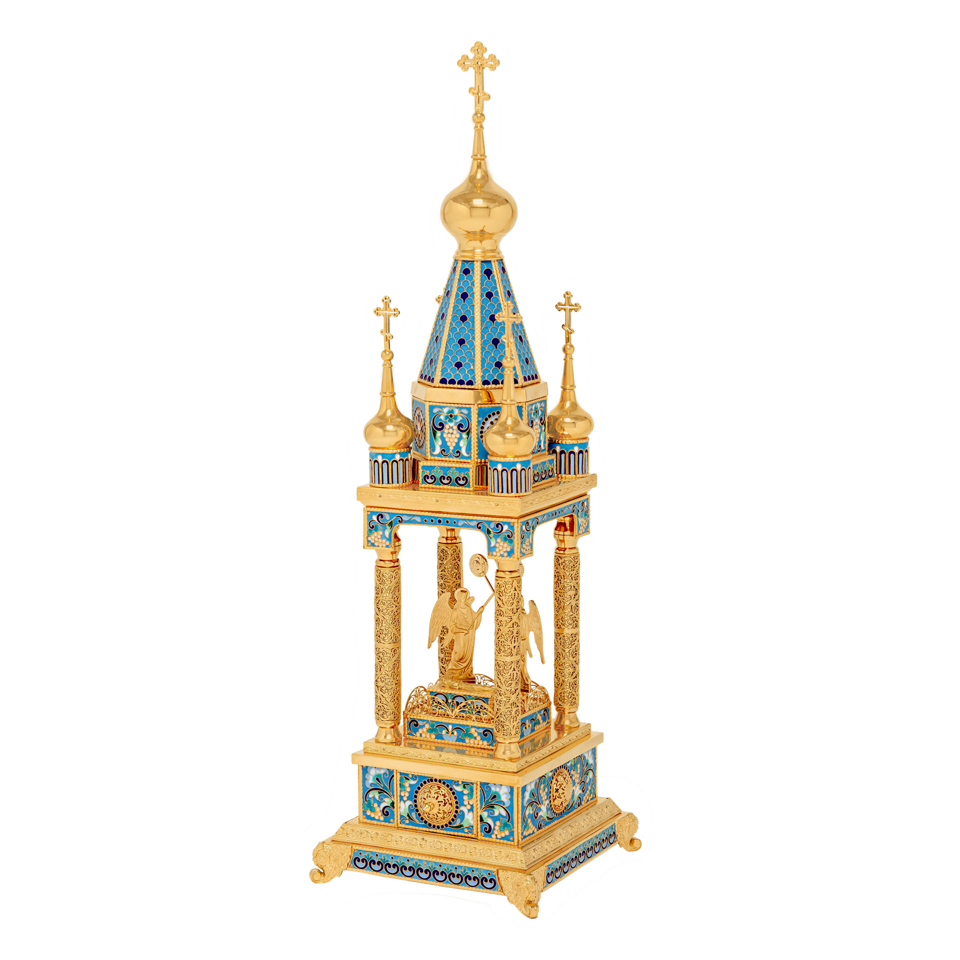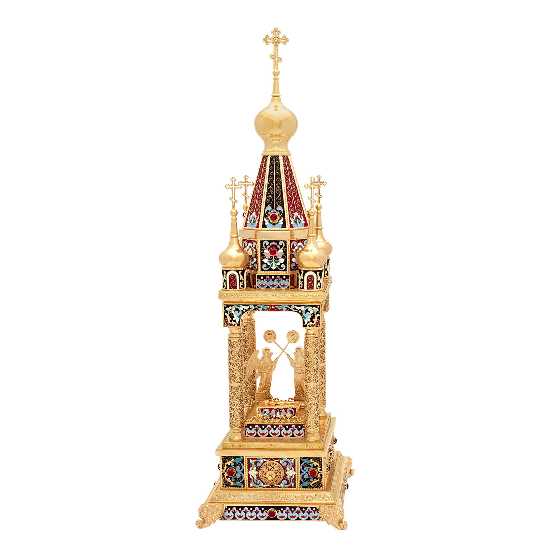 Благородная дарохранительница в форме часовни станет достойным местом для хранения Святых Даров. Верх часовни увенчан пятью крестами, а в центре часовни находится ящичек для Святых Даров, возле которого стоят два ангела с рипидами в руках. Дарохранительница украшена многочисленными геометрическими узорами, цветной эмалью, сияющими камнями, изящной финифтью и тонкой филигранью.