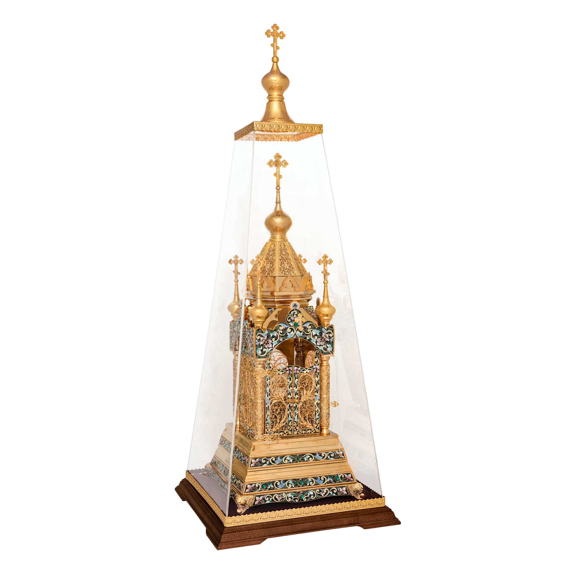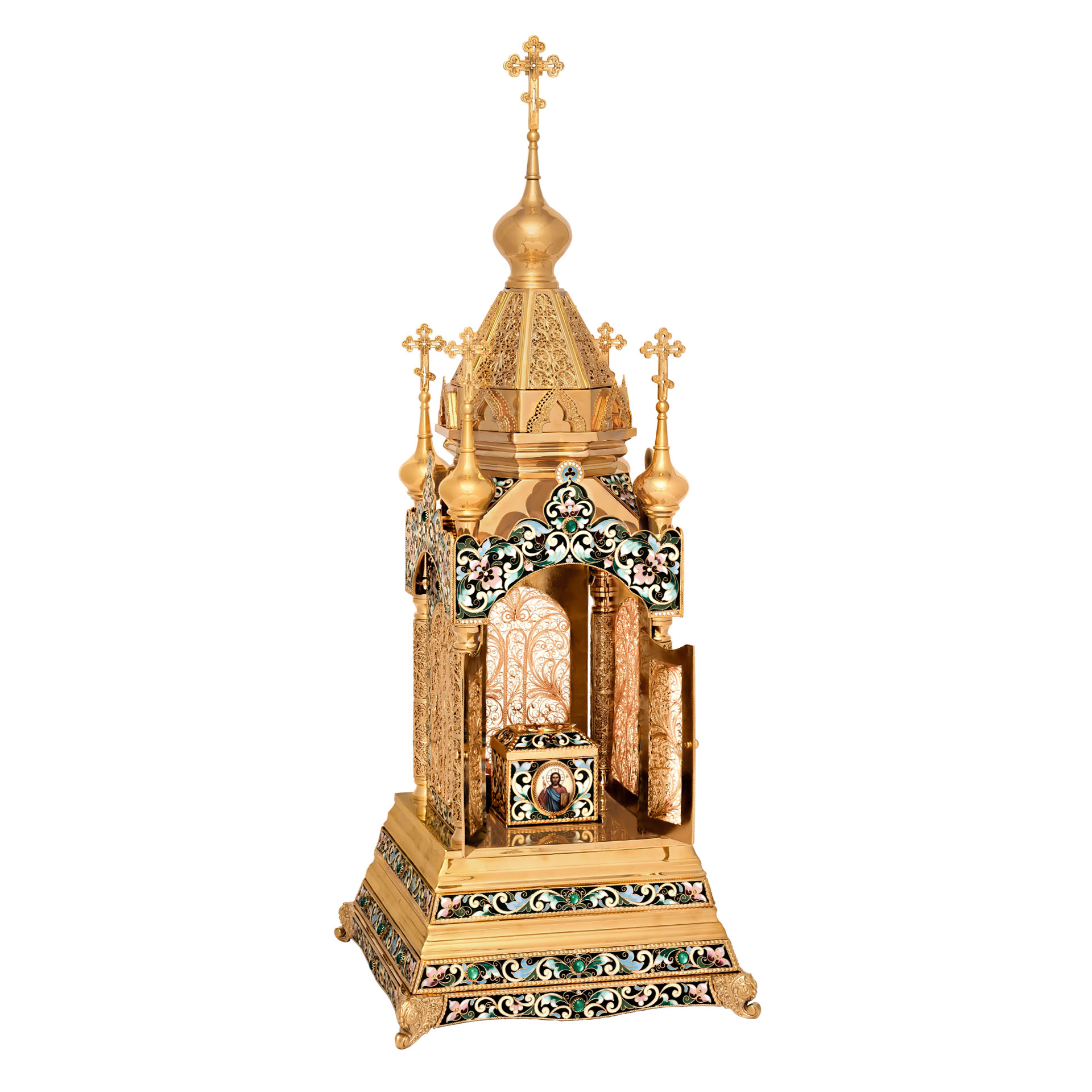 Сказочная дарохранительница в форме квадратного храма станет достойным местом для хранения Святых Даров. Верх храма увенчан пятью крестами, а в центре храма за закрытыми дверями находится ящичек для Святых Даров. Дарохранительница украшена тонкой филигранью и многочисленными геометрическими эмалевыми узорами, которые ярко выделяются на золотом фоне.