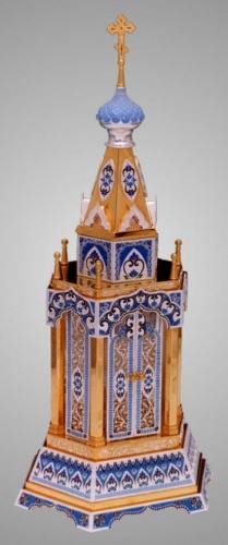 Праздничная дарохранительница в форме необычного шестигранного храма станет достойным местом для хранения Святых Таин. Весь храм украшен тонкой филигранью, яркой эмалью (цвет которой может быть изменен по желанию заказчика) и причудливыми геометрическими узорами. Ящичек со Святыми Дарами спрятан за дверями храма.