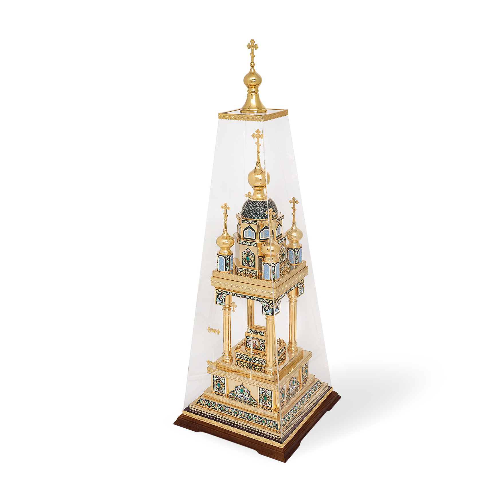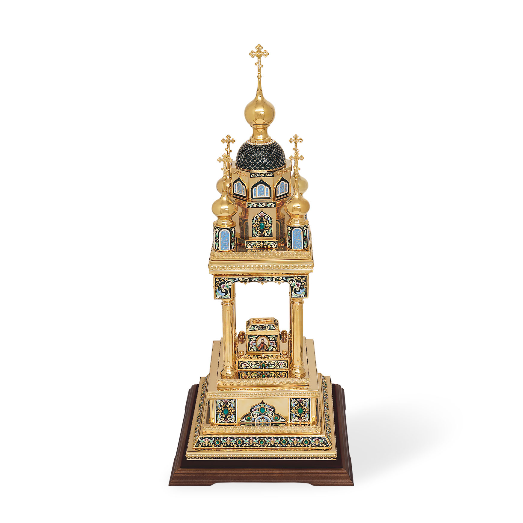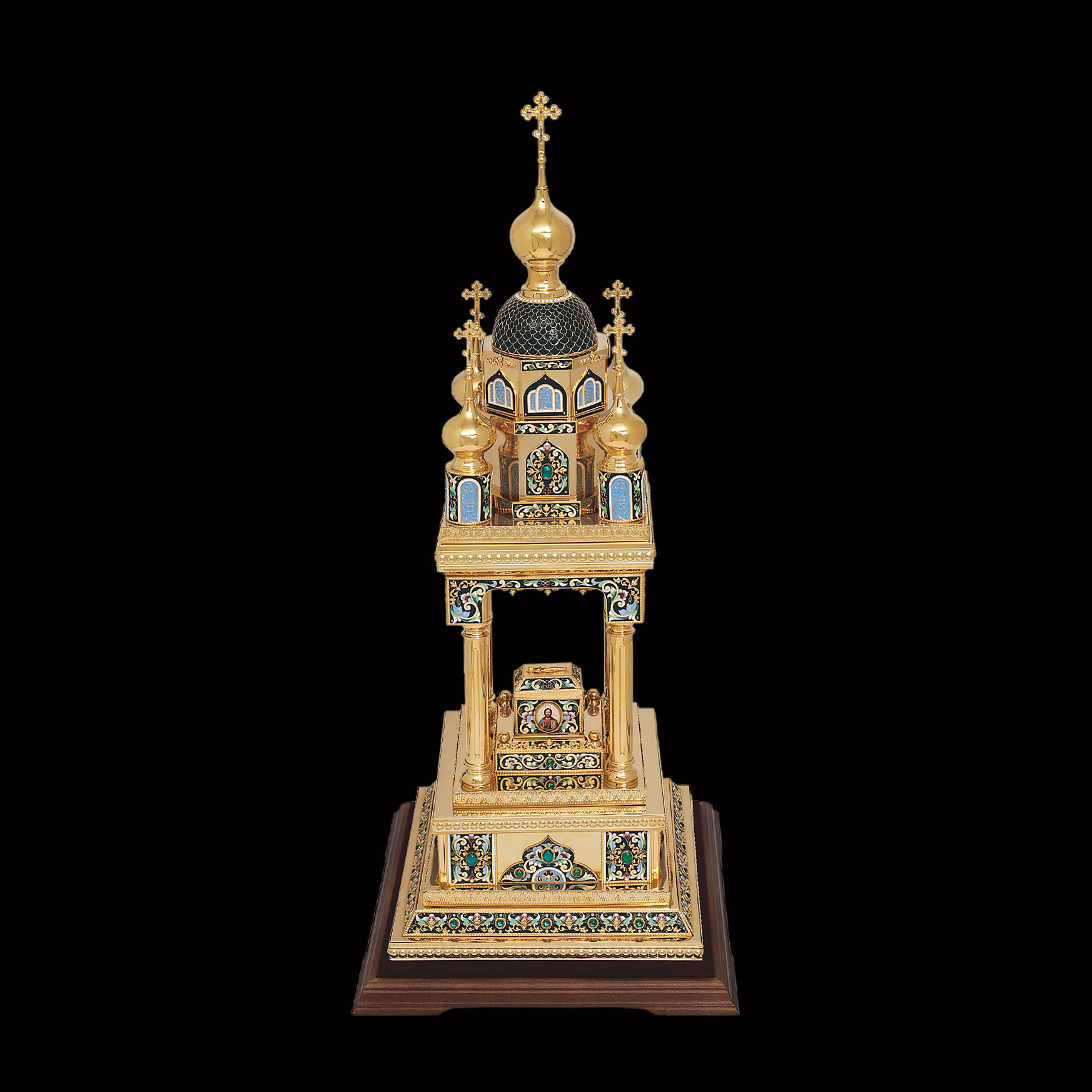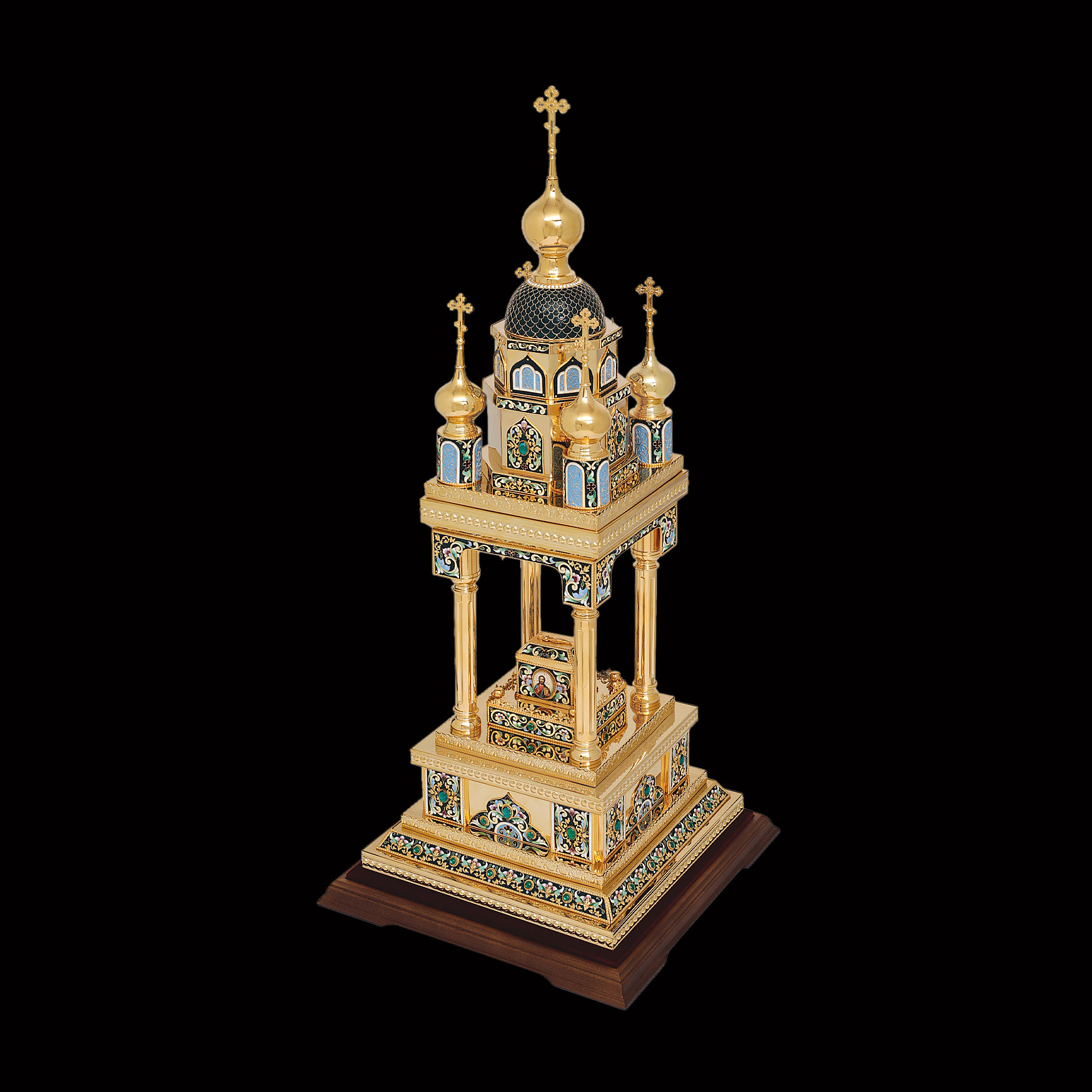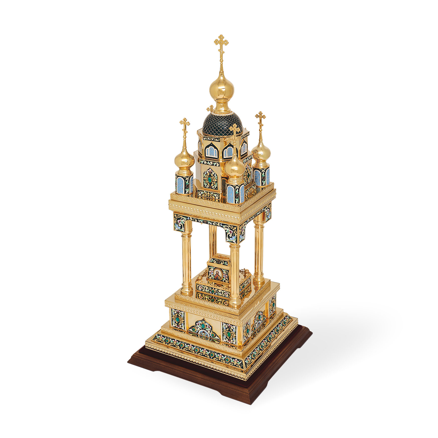 Медно-латуневая дарохранительница в форме квадратной часовни на четырех столбах станет достойным местом для хранения Святых Даров. Верх часовни увенчан пятью крестами, а в центре часовни находится ящичек для Святых Даров, украшенный иконами, выполненными в технике финифть. Дарохранительница украшена тонкой филигранью, сияющими камнями и многочисленными геометрическими эмалевыми узорами, которые ярко выделяются на золотом фоне. Цвет эмали может быть любым по пожеланию заказчика.