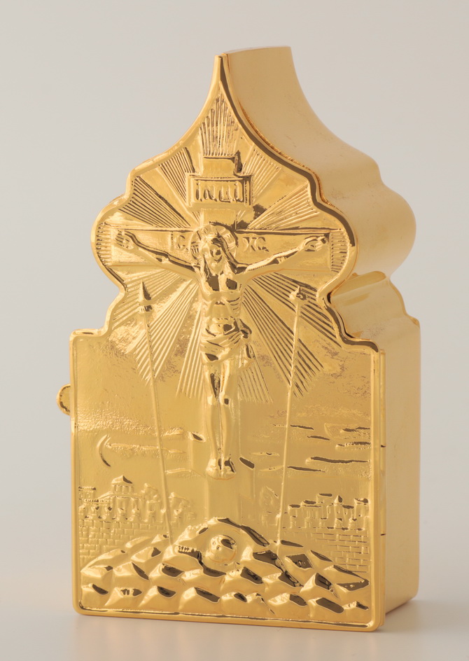 На крышке позолоченной дароносицы изображен Иисус Христос, распятый на Кресте, рядом – копие и трость, а внизу – камни Голгофской горы и Адамова глава. Символически это указывает на то, что Смертью Второго Адама (Христа) была одержана победа над смертью, внесенной в мир первым Адамом.