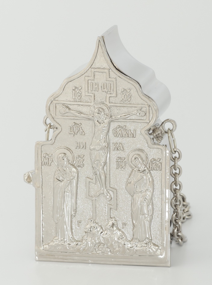 На крышке никелированно-посеребренной дароносицы изображен Иисус Христос, распятый на Кресте. Рядом изображены Богородица и Иоанн Богослов, а внизу – камни Голгофской горы и Адамова глава. Символически это указывает на то, что Смертью Второго Адама (Христа) была одержана победа над смертью, внесенной в мир первым Адамом.