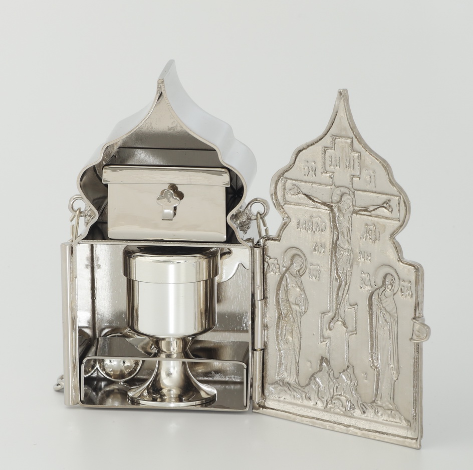 В дароносице хранится главная святыня христиан – Тело и Кровь Христова, – поэтому священнослужители с особым благоговением носят её на груди. Специально для этого у данной модели дароносицы есть металлическая цепочка. Внутри дароносицы есть всё, необходимое для Причащения: ящичек для Тела Христова, лжица и маленькая чаша, закрывающаяся крышкой. Но, благодаря легкому весу, дароносица будет удобна при транспортировке.