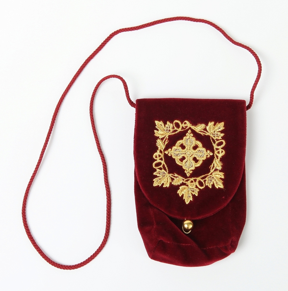 Дароносица выполнена из немецкого бархата. На крышке изделия автоматическая вышивка. Доступно исполнение во всех богослужебных цветах.