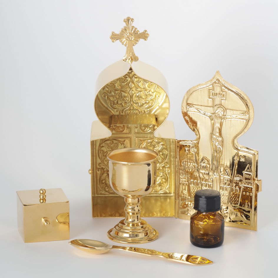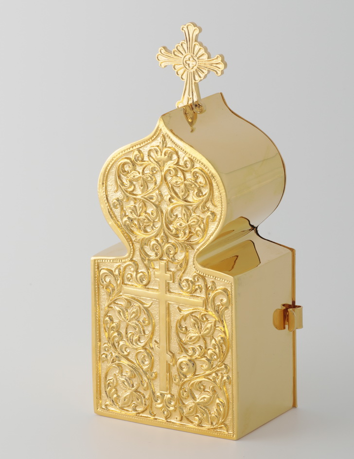 В ситуациях, когда человек по состоянию здоровья не может прийти в храм, священник причащает больного на дому. Для переноса Святых Даров используется дароносица. Внутри данной модели есть всё, необходимое для Причащения: ящичек для Тела Христова, лжица и маленькая чаша.